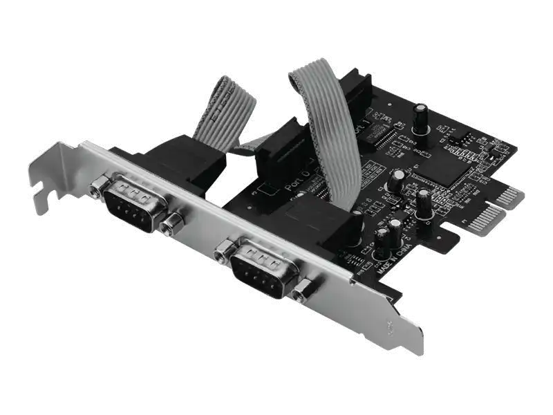 · 2 x DSUB 9, serielle Schnittstellen, männlich, UART 16C950 · Chipsatz: AX99100 · Datentransferrate bis zu 1.5 Mbps · Entspricht der PCI Express Base Specification 2.0 · Kompatibel mit PCI Power Management 1.2 · Betriebstemperatur: 0 °C - 70 °C · Luftfeuchtigkeit beim Betrieb: 0% - 85% RH (nicht kondensierend) · Unterstützt Windows 10, 8.1, 8, 7, Vista, XP, macOS und Linux