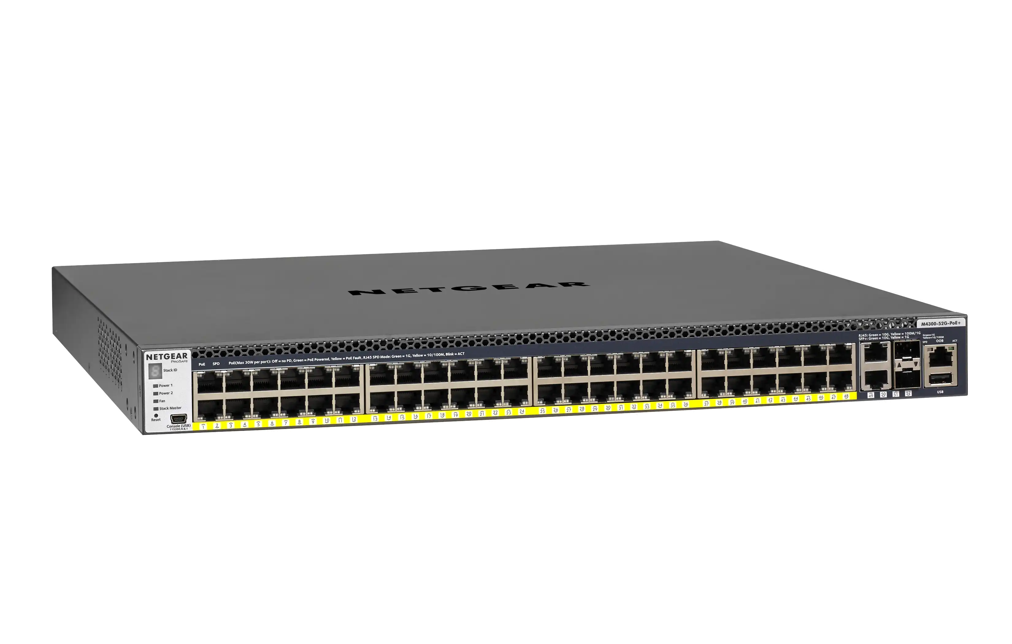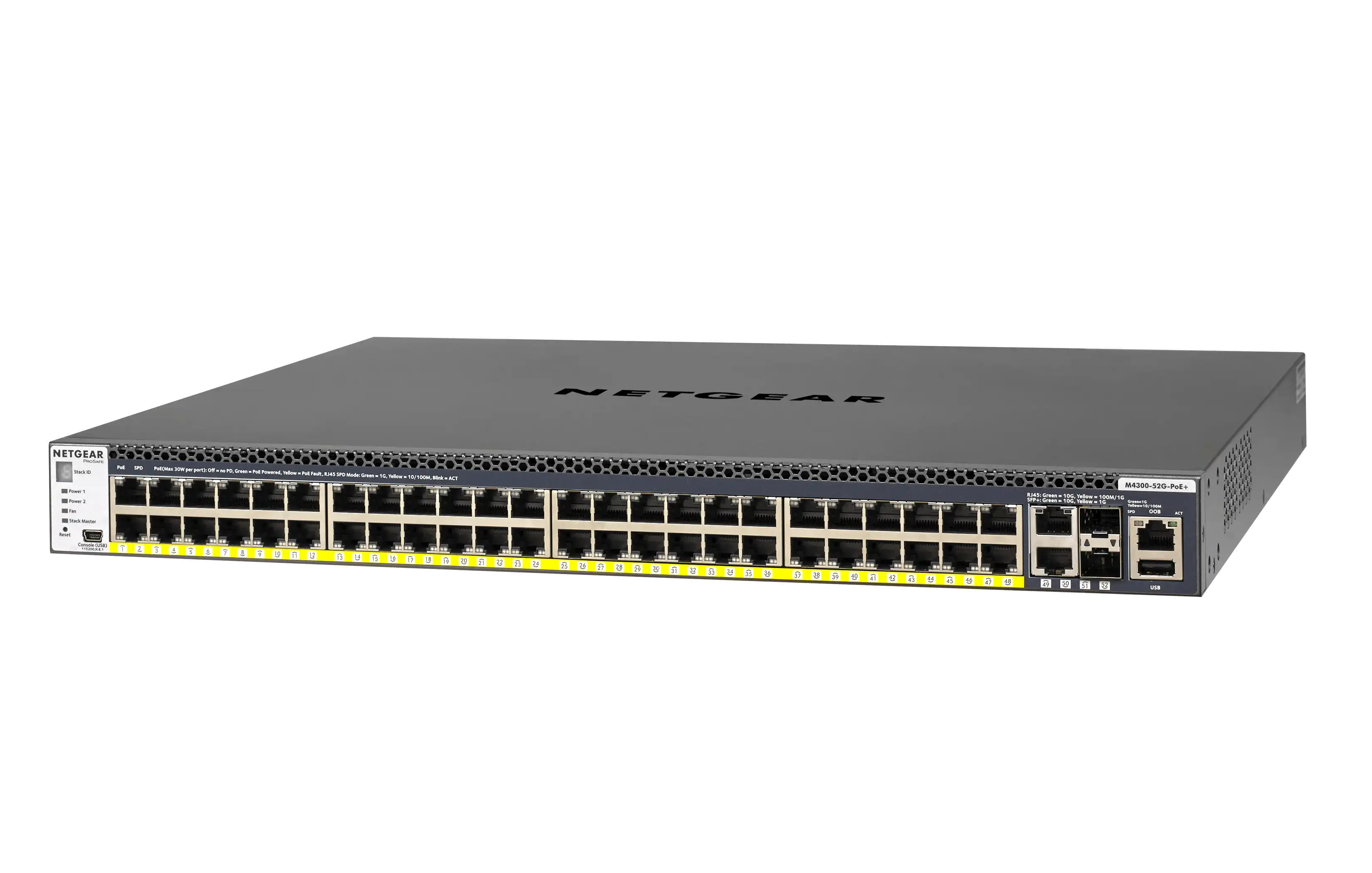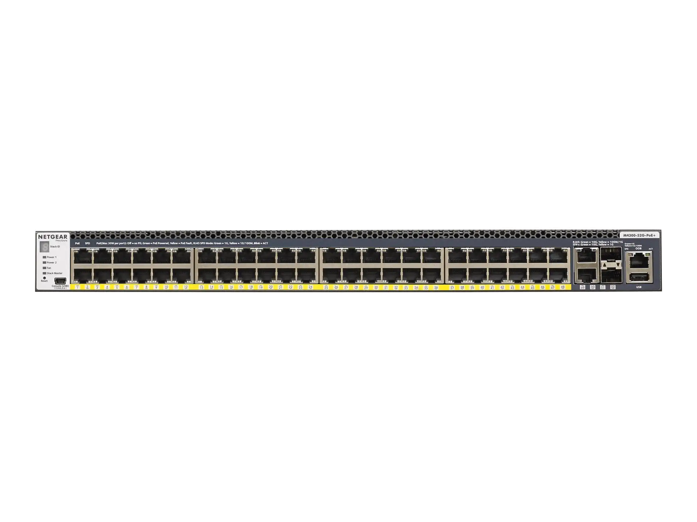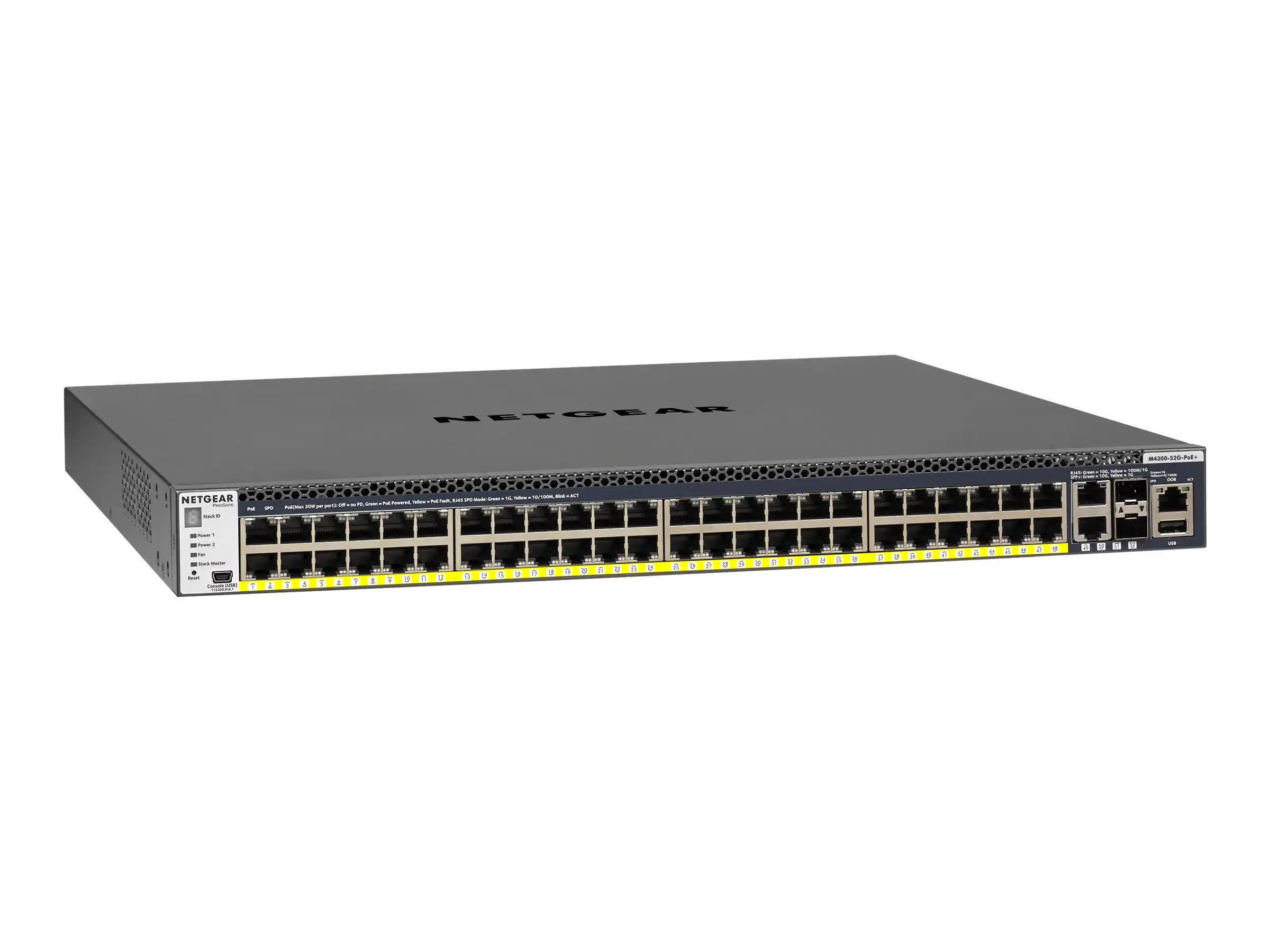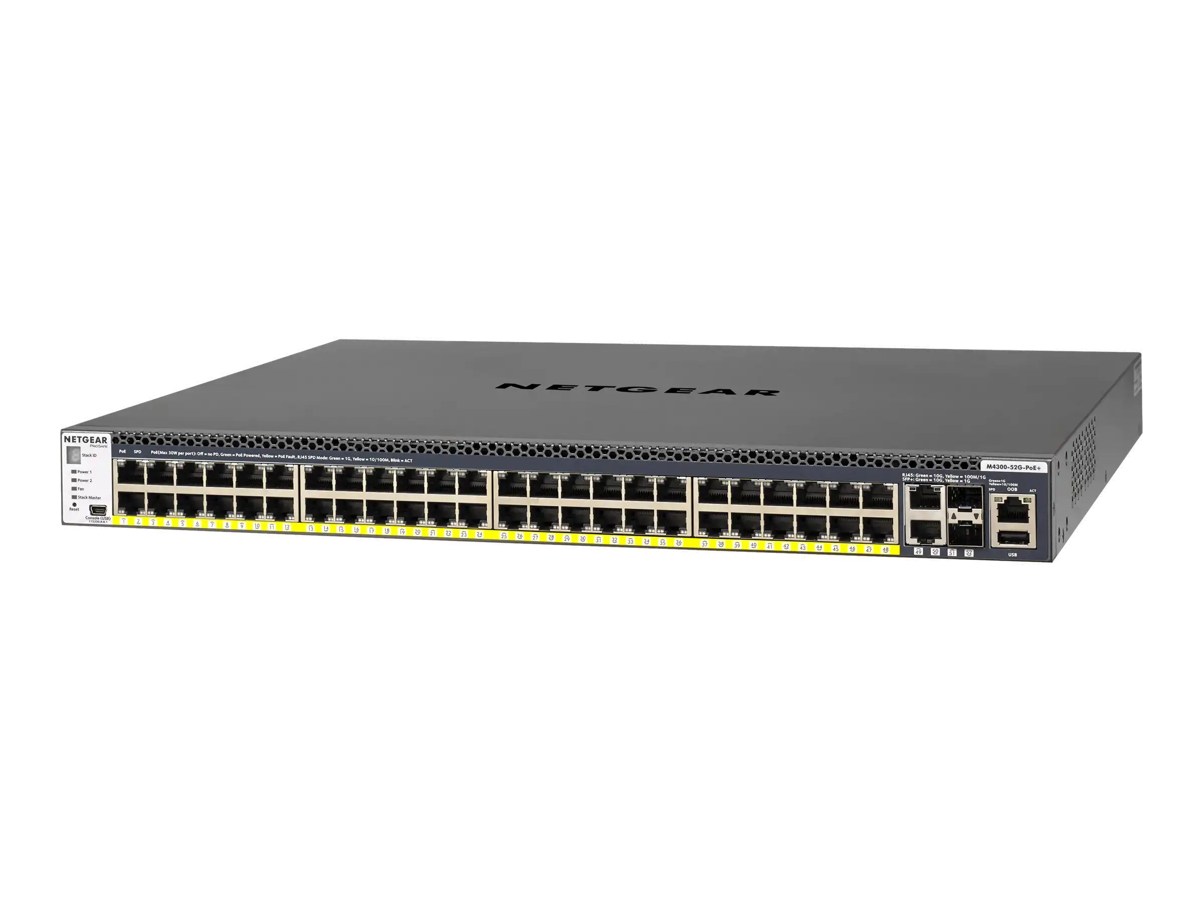 M4300-52G-PoE+, Switch, L3, managed, 2x10/100/1000/10000 + 2x10 Gigabit SFP+ + 48x10/100/1000 (PoE+), Luftstrom von vorne nach hinten, an Rack montierbar, PoE+ (480 W), L2/L3/L4