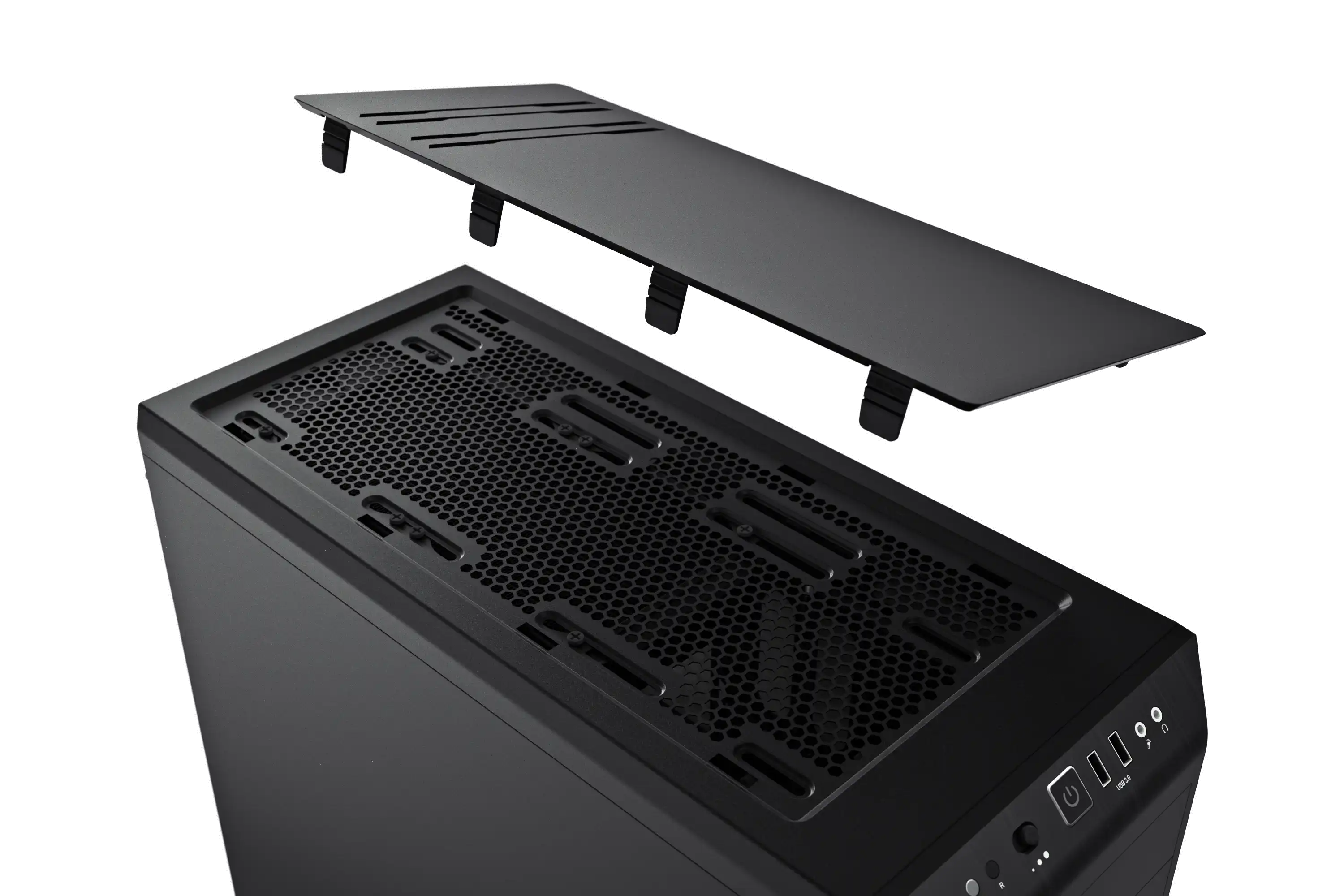 Öffnung des Top-Covers kann dreistufig eingestellt werden: geschlossen für absolut leisen Betrieb, halb geöffnet für bessere Luftableitung oder komplett entfernt, um einen Radiator zu installieren