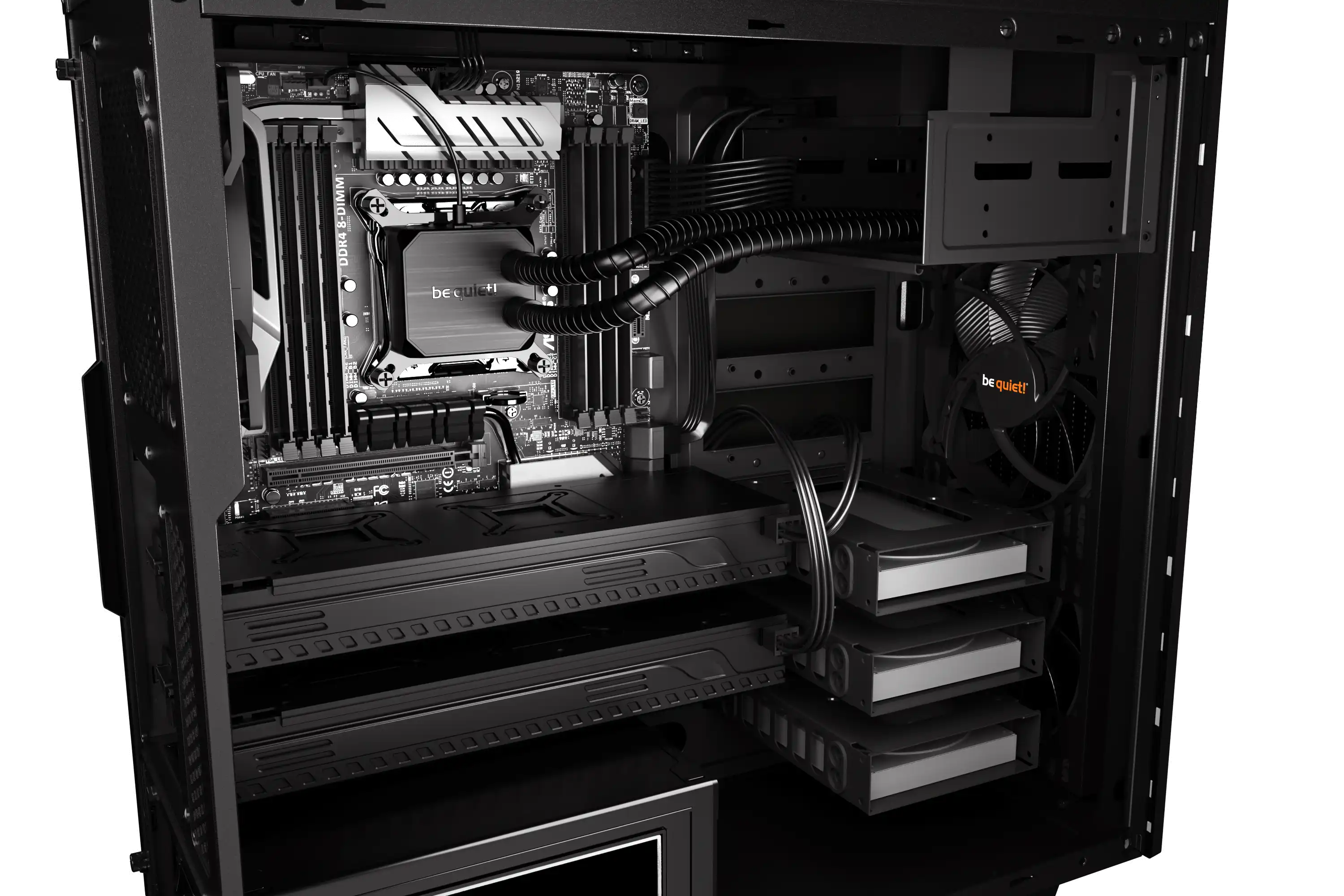 Flüsterleiser Betrieb dank zwei vorinstallierter Pure Wings 2 Lüfter, die mit neun luftstromoptimierten Lüfterblättern für einen leisen Betrieb bei gleichzeitig hohem Luftdruck sorgen