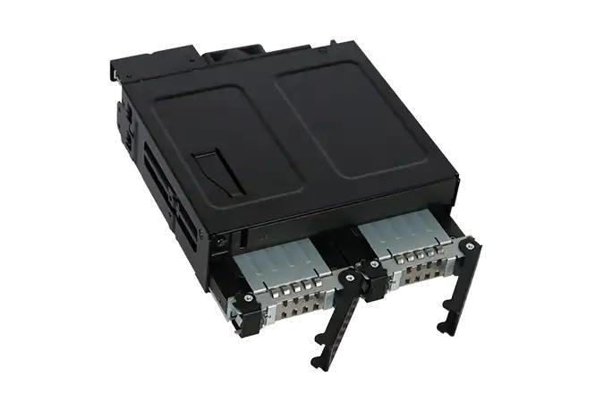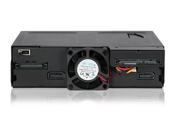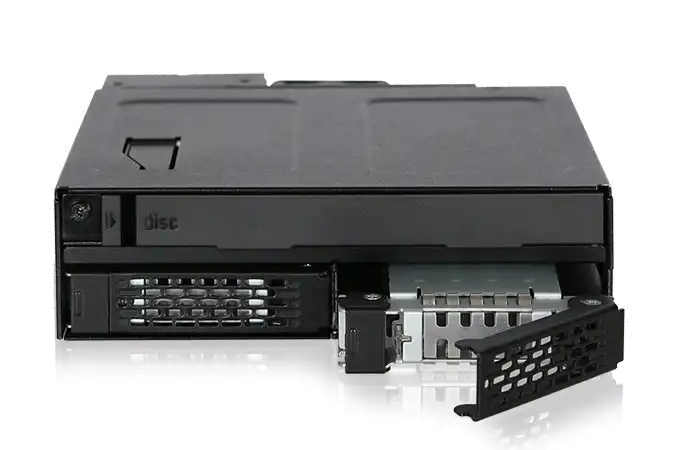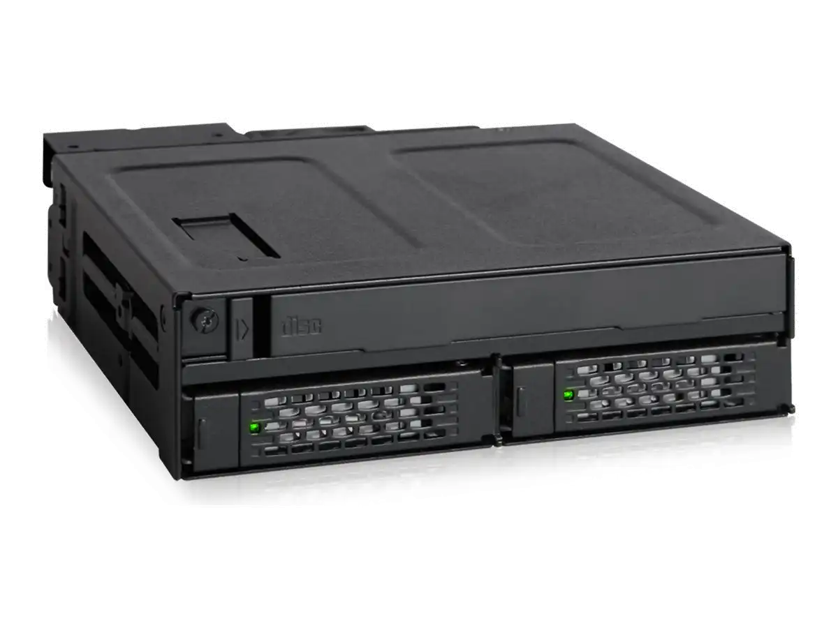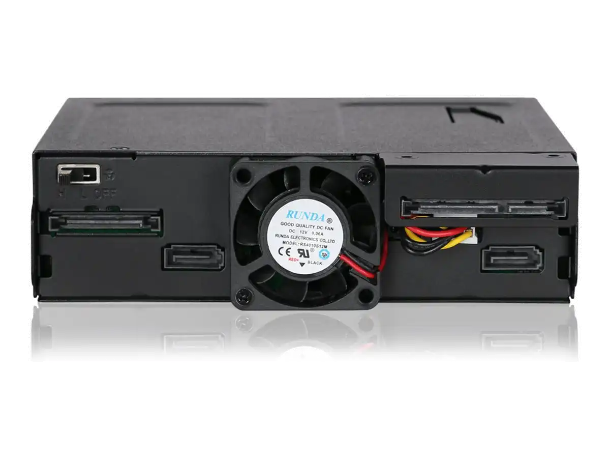 Mit dem ToughArmor MB602SPO-B stellt ICY DOCK einen robusten Hot Swap Wechselrahmen für 2x SATA/SAS SSDs und HDDs von bis zu 15 mm Bauhöhe und 1x Slim 12,7 mm oder Ultra-Slim 9,5 mm CD/DVD/Blu-ray ROM Laufwerk in einem 5,25" Einbauschacht vor. Dieser ist komplett aus Metall gefertigt und entwickelt für kommerzielle Anwendungen in militärischen oder medizinischen Systemen, PCs in Luft- und Seefahrt, in-vehicle Systemen, Servern, Workstations und mobilen Computern. Sorgen Sie für optimale Betriebstemperaturen mit dem einstellbaren 40 mm Lüfter und zahlreichen Lüftungsöffnungen. Entnehmbare Trays / Einschübe mit Vibrationsschutz schützen Ihre Laufwerke selbst in widrigen Betriebsumgebungen und die individuellen Status-LEDs geben Ihnen jederzeit den vollen Überblick über Ihre Laufwerke.