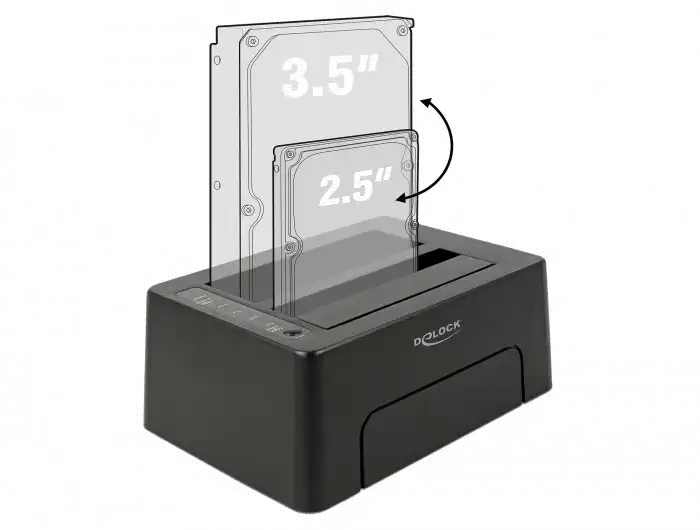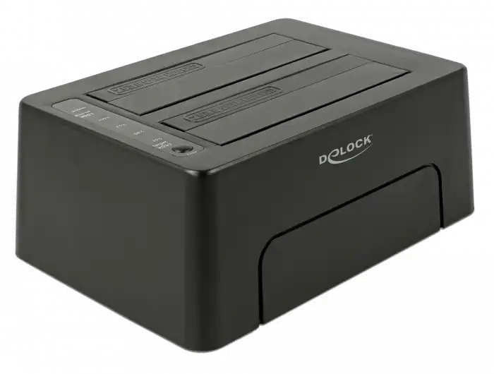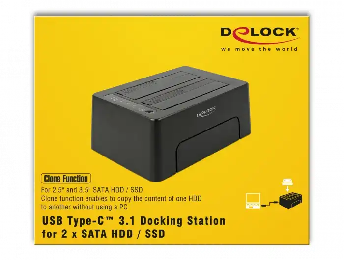 Diese Dockingstation von Delock dient zum externen Anschluss von bis zu zwei 2.5" oder 3.5" SATA HDDs oder SSDs über die USB-C Schnittstelle. Durch diese Lösung wird kein externes Gehäuse benötigt, da das Laufwerk direkt in die Dockingstation eingesetzt wird. Zudem ermöglicht die Klon Funktion, dass die Daten von einem Laufwerk auf ein anderes Laufwerk kopiert werden ohne Verwendung eines PCs.