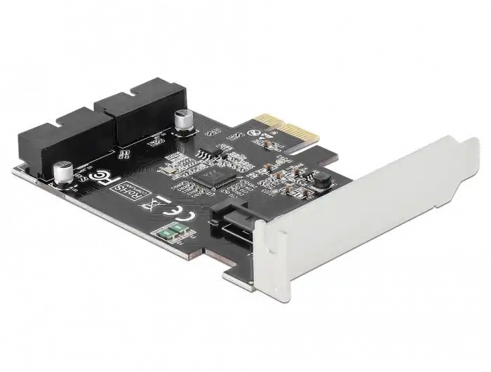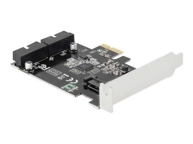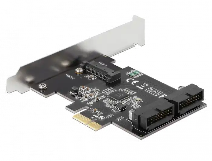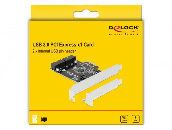 Die PCI Express Karte von Delock erweitert den PC um zwei interne USB 3.0 Pfostenstecker. An die Karte können verschiedene USB Geräte, wie z. B. Docking Stationen, Card Reader, externe Gehäuse etc., angeschlossen werden, mit Hilfe eines optionalen Kabels.