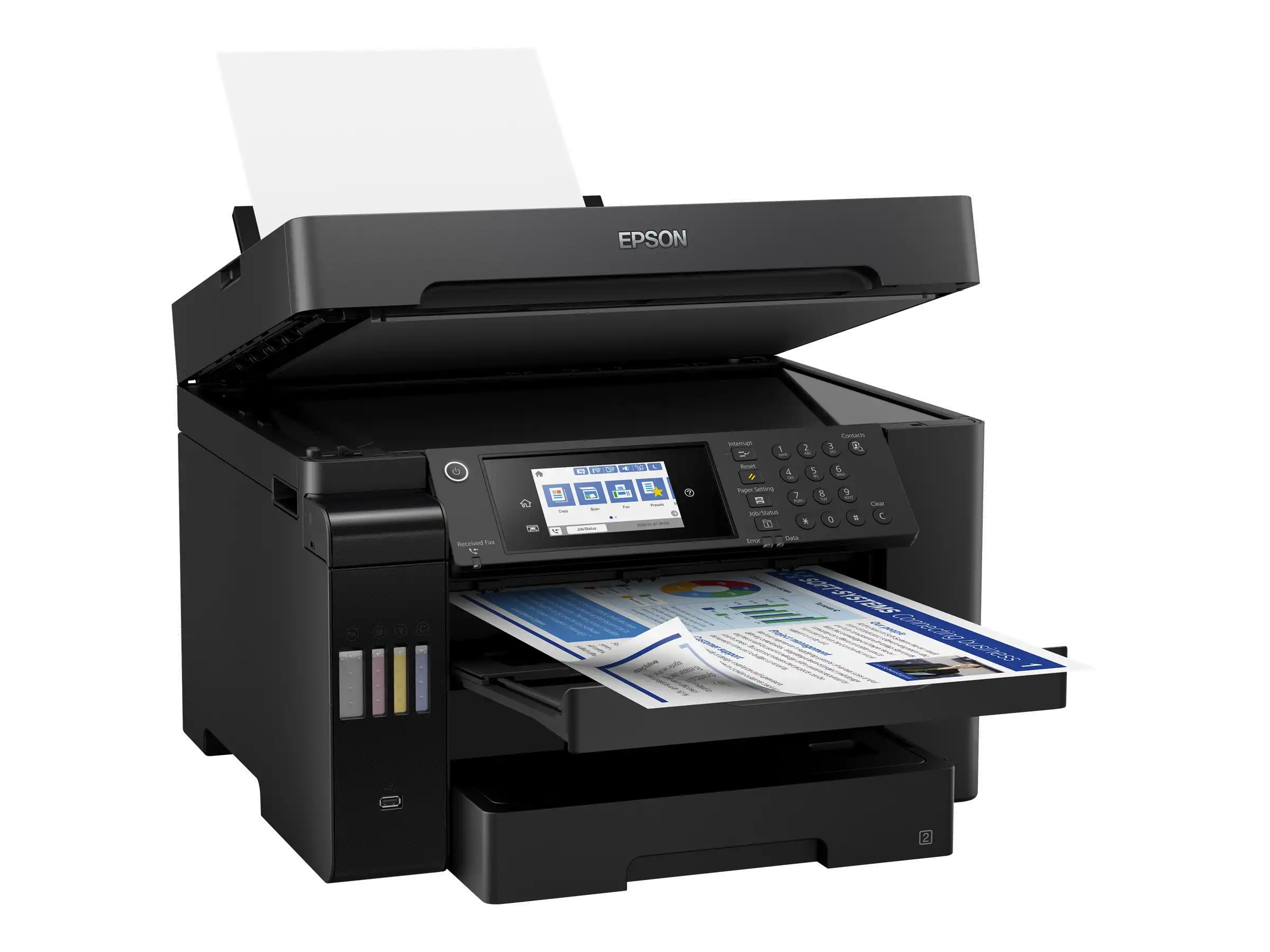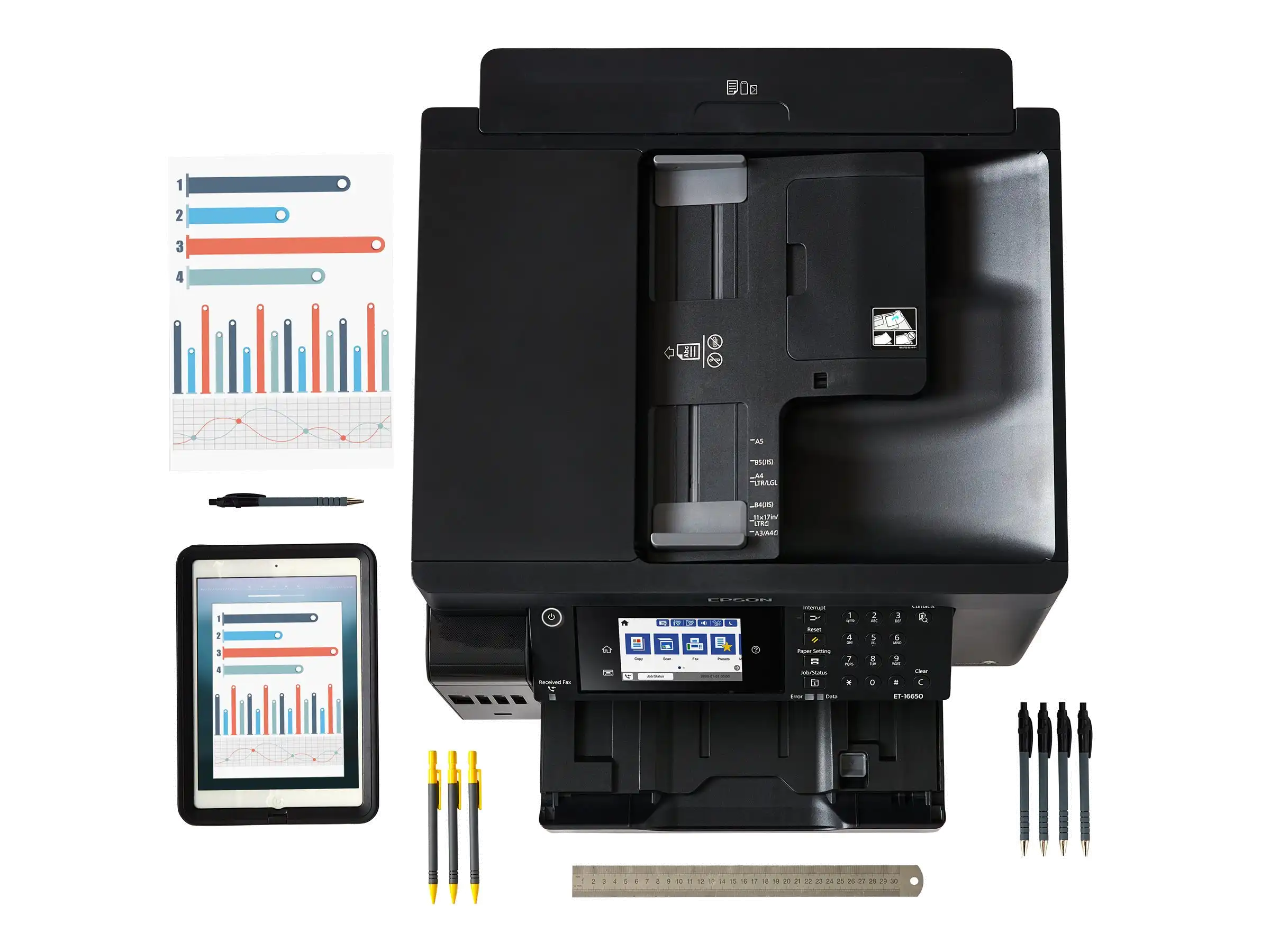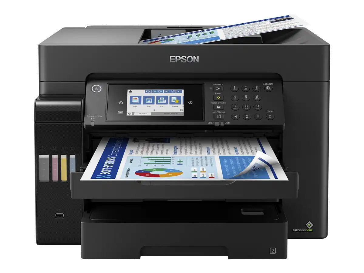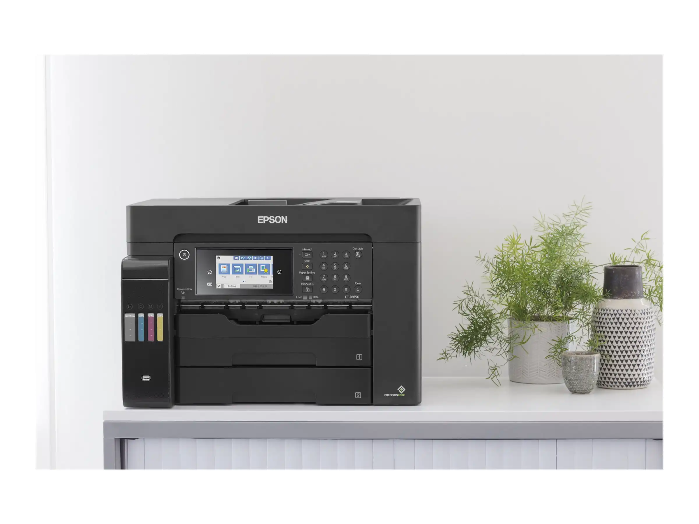 DIN-A3-EcoTank-Drucker mit vielen Funktionen Der ET-16650 wurde für das Drucken, Scannen, Kopieren und Faxen bis zum Format DIN A3+ konzipiert. Sämtliche Funktionen können Sie einfach und bequem über den 10,9 cm großen LCD-Touchscreen mit zusätzlichen Tasten auswählen und ausführen.
