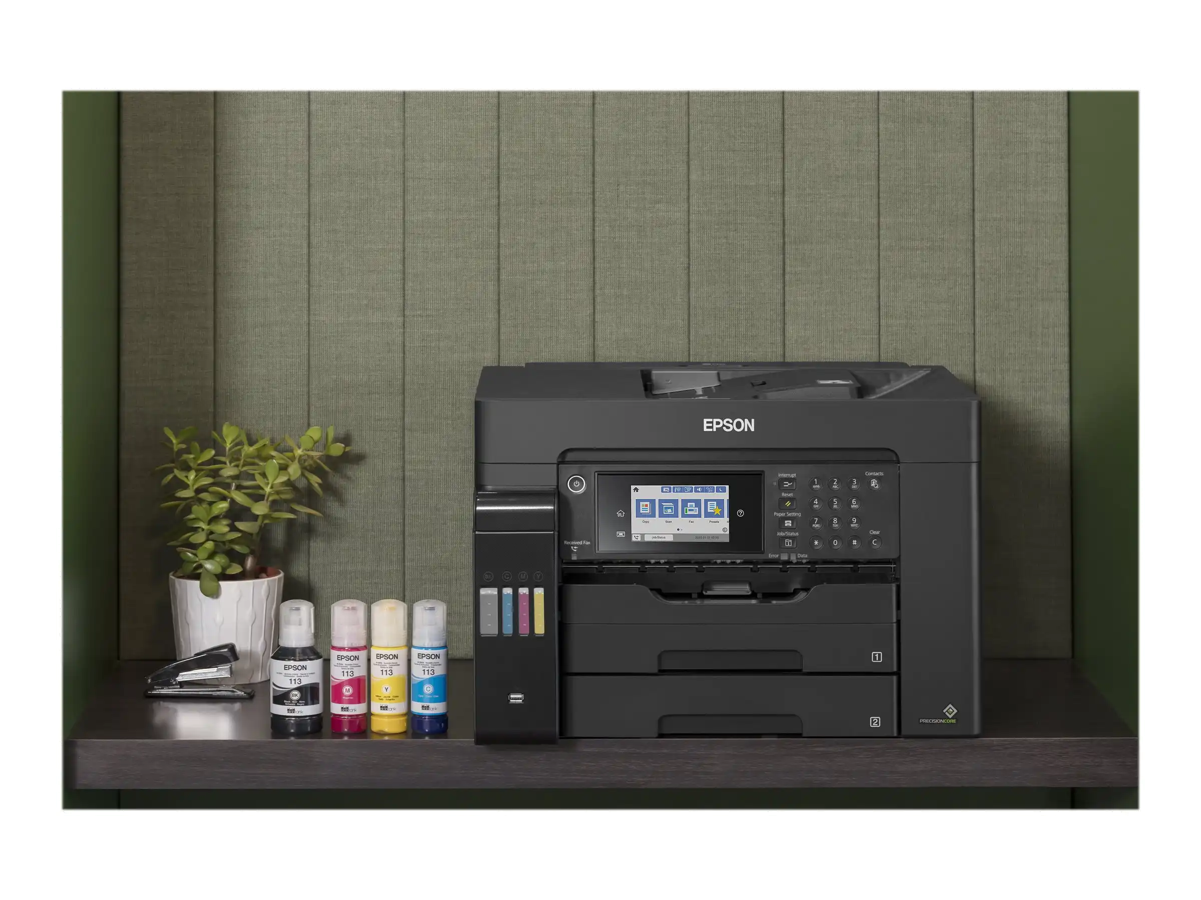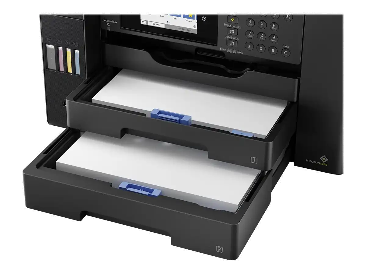 Einfach in der Bedienung und zuverlässig Das Befüllen der großen vorderen Tintentanks ist mit den wiederverschließbaren, intuitiven und tropffreien Tintenflaschen einfach. Der Heat-Free-PrecisionCore-Druckkopf ist für seine Geschwindigkeit, Qualität, Zuverlässigkeit und Effizienz bekannt und überdauert die Lebensdauer des Druckers.