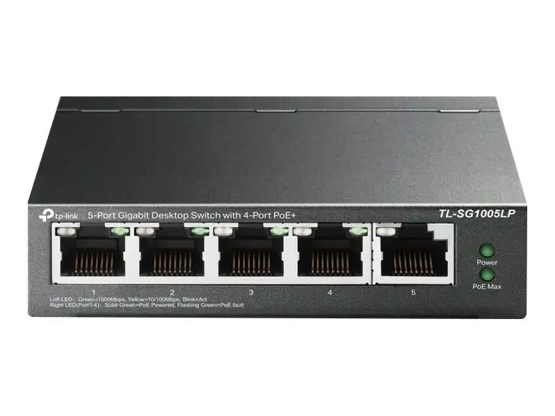 TL-SG1005LP 5-Port Gigabit Desktop Switch with 4-Port PoE+ PORT: 4× Gigabit PoE+ Ports, 1× Gigabit Non-PoE PortSPEC: 802.3af/at, 40 W PoE Power, Desktop Steel CaseFEATURE: Plug and Play