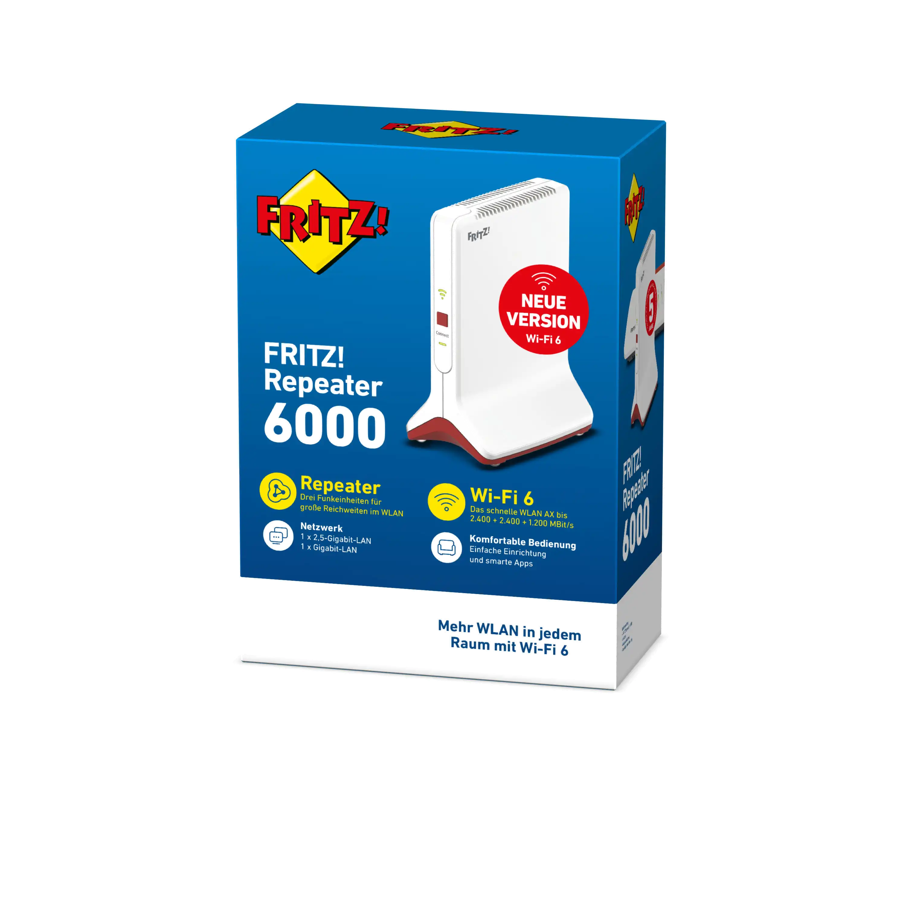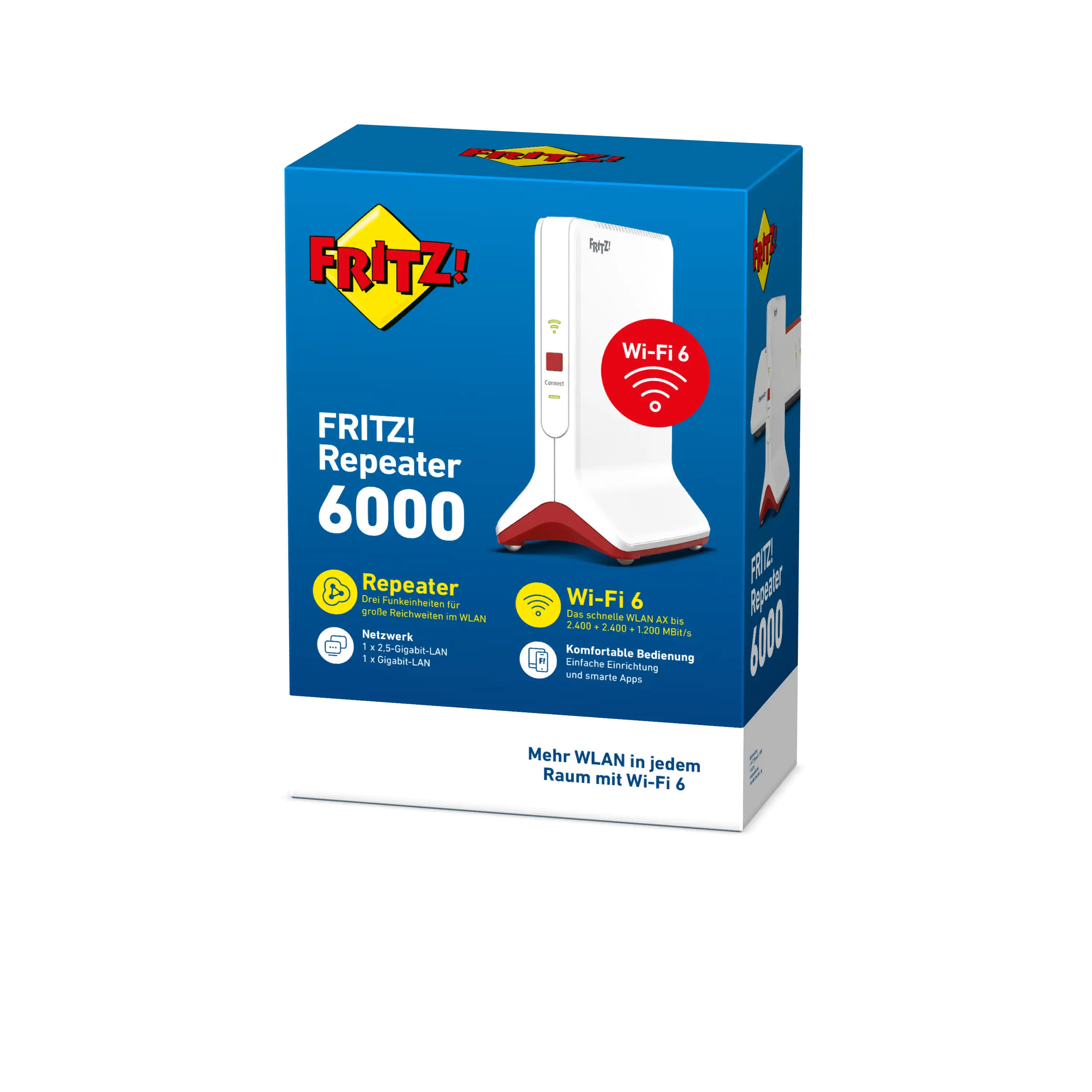 Mit drei Funkeinheiten, die in Summe einen Datendurchsatz von bis zu 6.000 MBit/s erzielen können, stellt der Repeater eine stabile Verbindung und ein Maximum an Bandbreite für alle verbundenen WLAN-Geräte zur Verfügung. Gleichzeitig erhöht der FRITZ!Repeater 6000 die Reichweite im WLAN und sorgt für eine perfekte Funkabdeckung bis in den letzten Winkel von Haus und Wohnung.