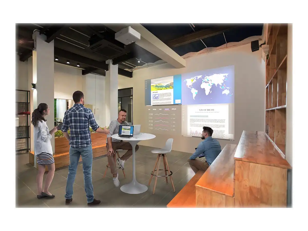 Diese Projektionslösung bietet höchste Flexibilität. Mit der Split-Screen-Funktion können zwei oder vier Bilder aus verschiedenen Quellen gleichzeitig nebeneinander angezeigt werden. Endgeräte können über Kabel oder auch optional kabellos1 mit Miracast-Unterstützung1 mit dem Projektor verbunden werden. HDBaseT-Inhalte werden einfach ohne Qualitätsverlust übertragen.