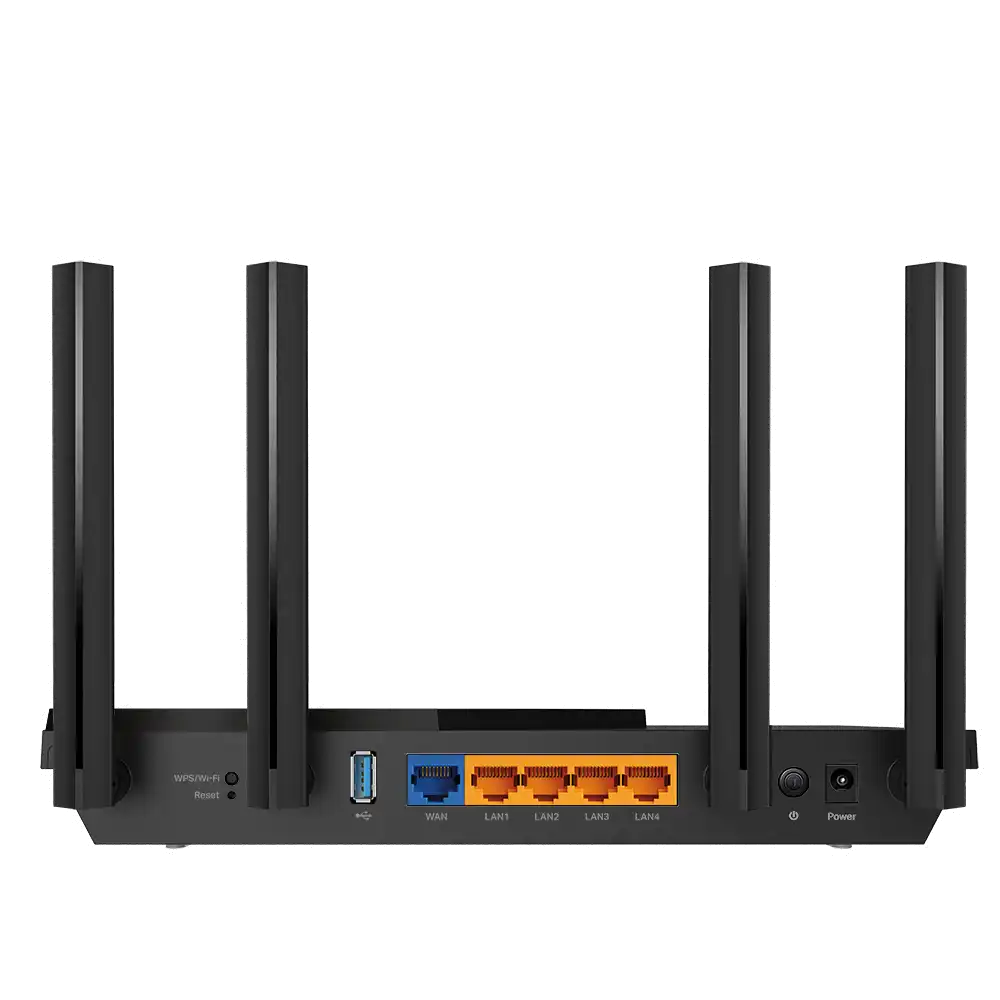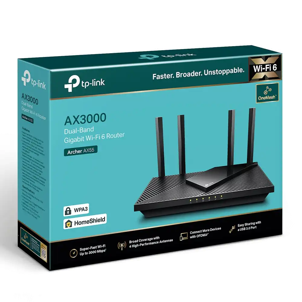Archer AX55 AX3000 Dual-Band Wi-Fi 6 RouterSPEED: 574 Mbps at 2.4 GHz + 2402 Mbps at 5 GHz SPEC: 4× Antennas, 1× Gigabit WAN Port + 4× Gigabit LAN Ports, USB 3.0 Port, 1024-QAM, OFDMA, HE160FEATURE: Tether App, WPA3, Access Point Mode, IPv6