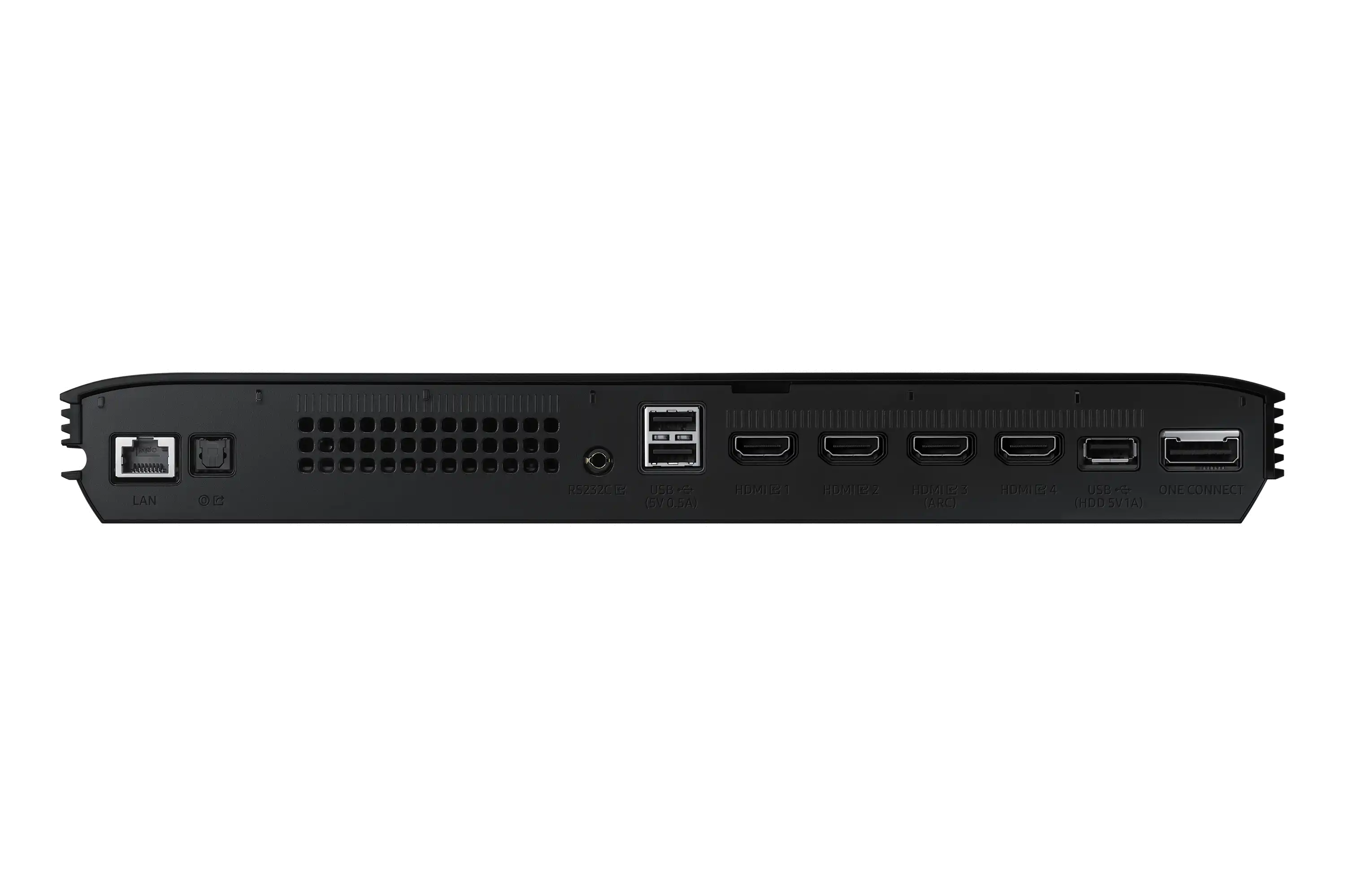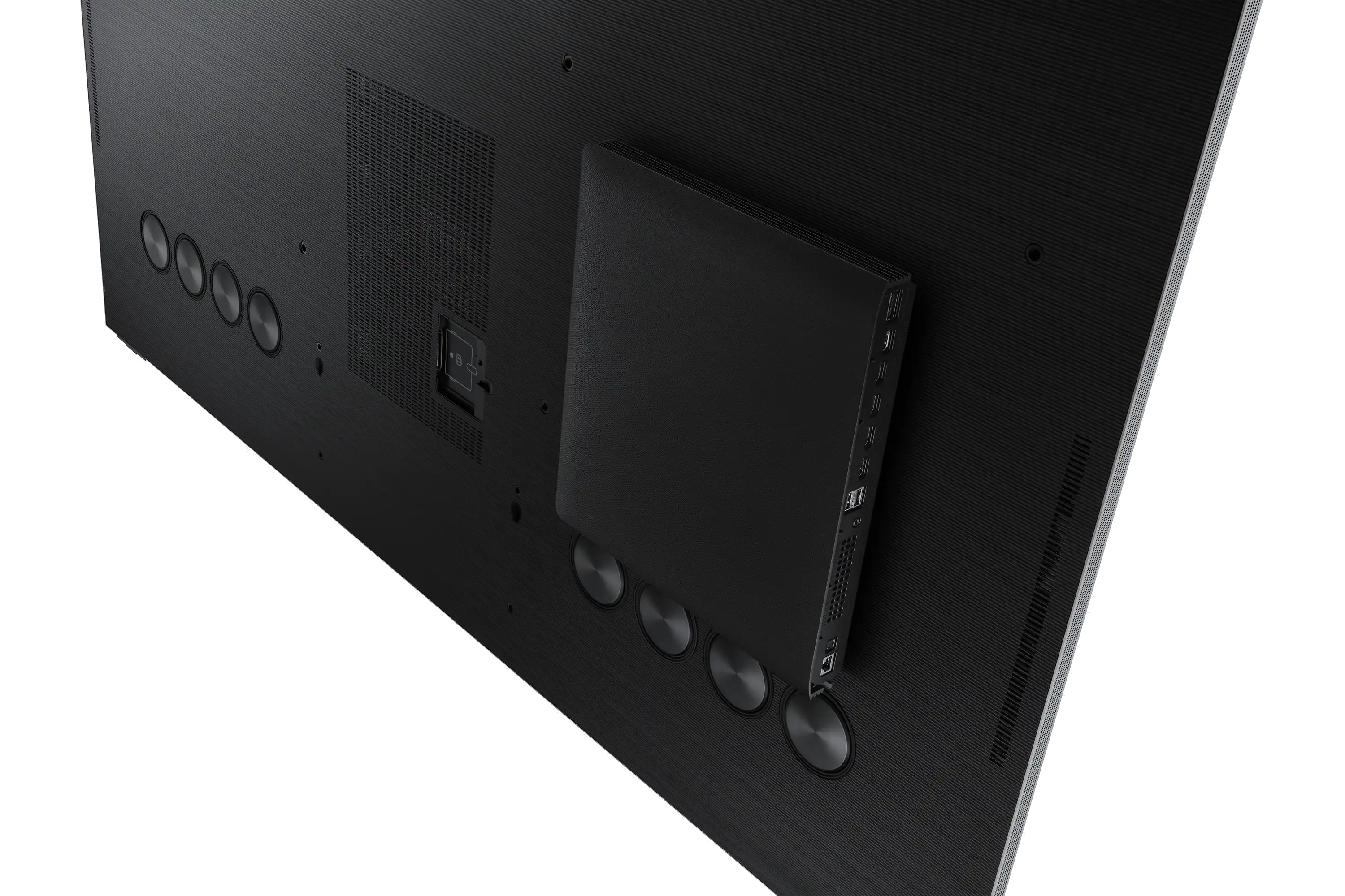 Aufsteckbarer Slim One Connect Sorgen Sie für Ordnung, indem Sie Ihre Kabel in der schlanken One Connect Box-Lösung aufbewahren. Ihr dezentes Design bleibt durch die Befestigung am TV-Ständer, das Einrasten an der hinteren Abdeckung oder das Verstauen in einem Schrank verborgen. Wie auch immer Sie sich entscheiden, Sie werden ein reines, ablenkungsfreies Fernsehen von seiner besten Seite erleben.