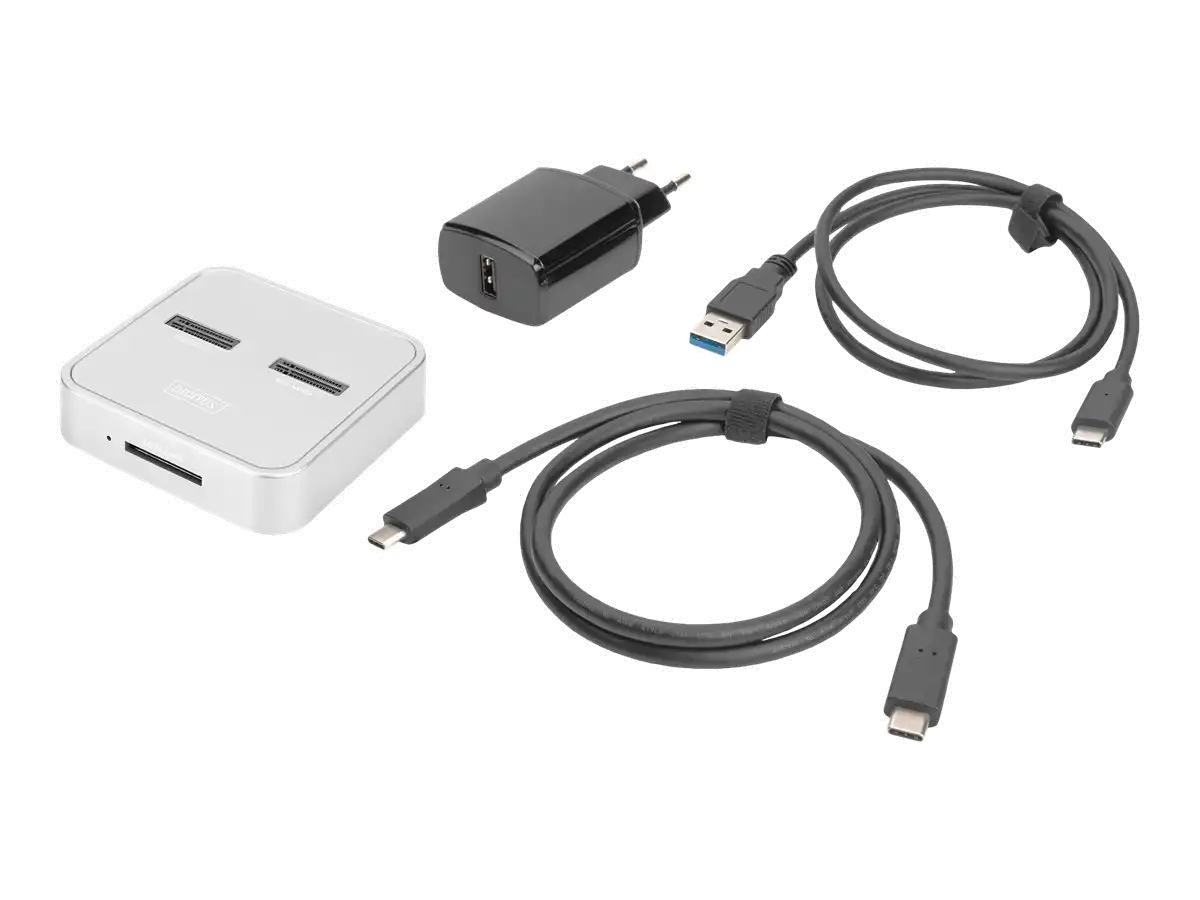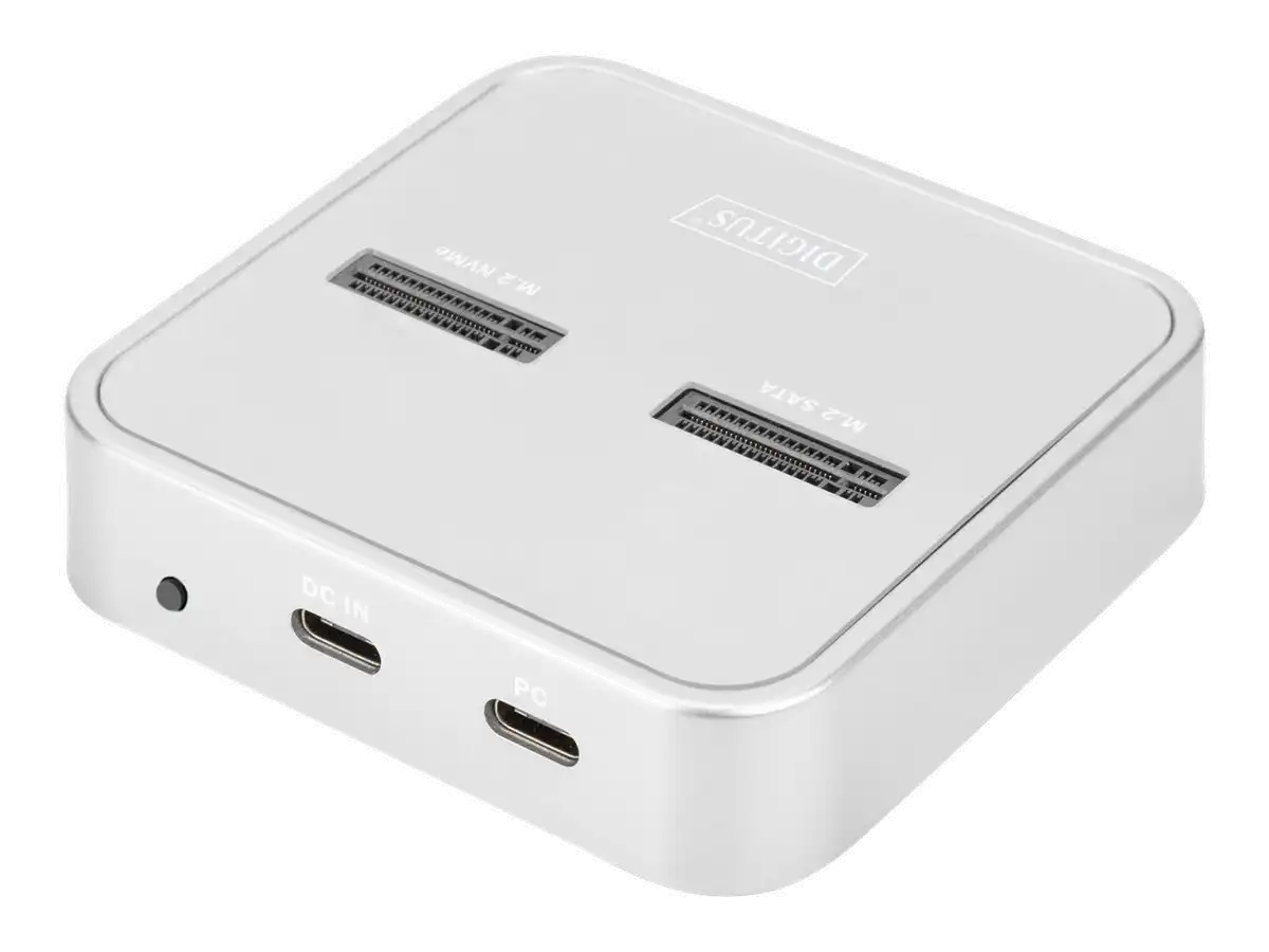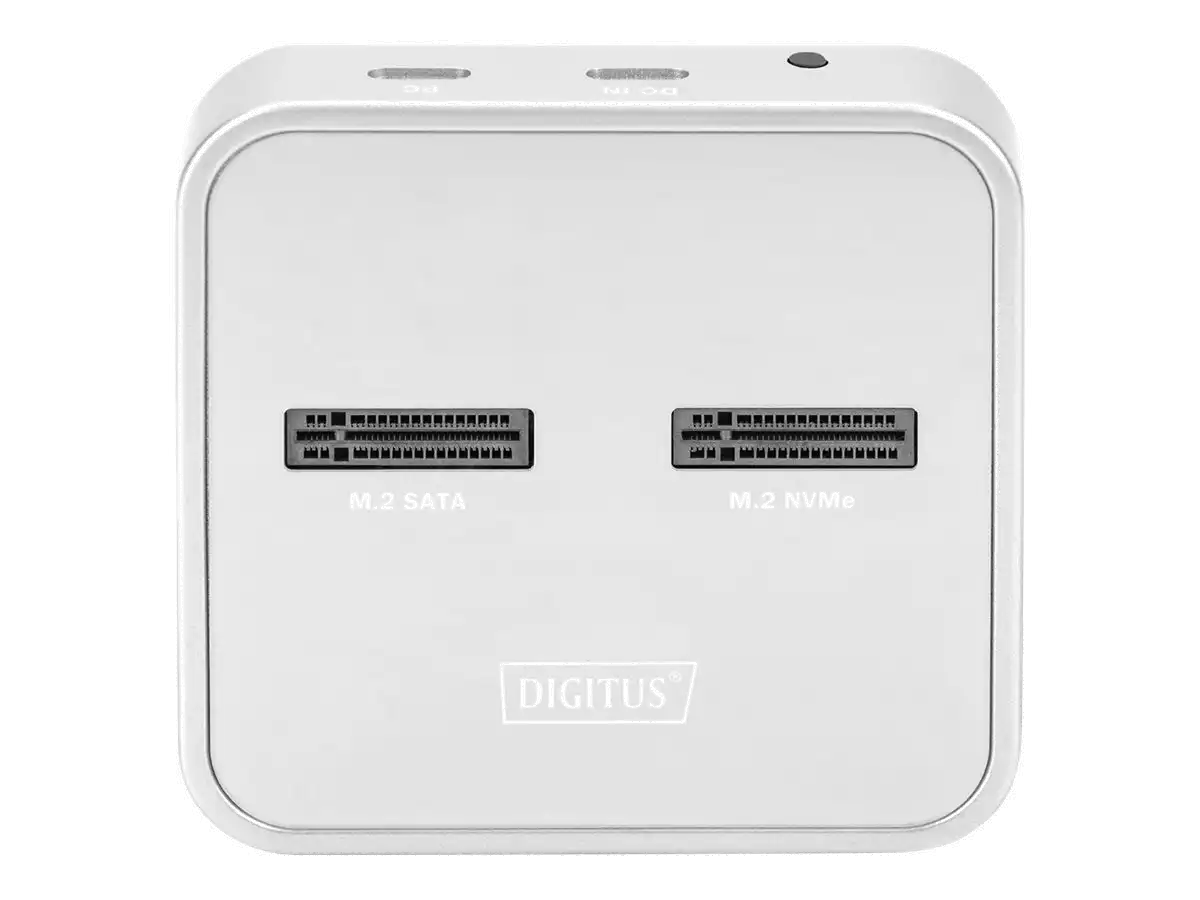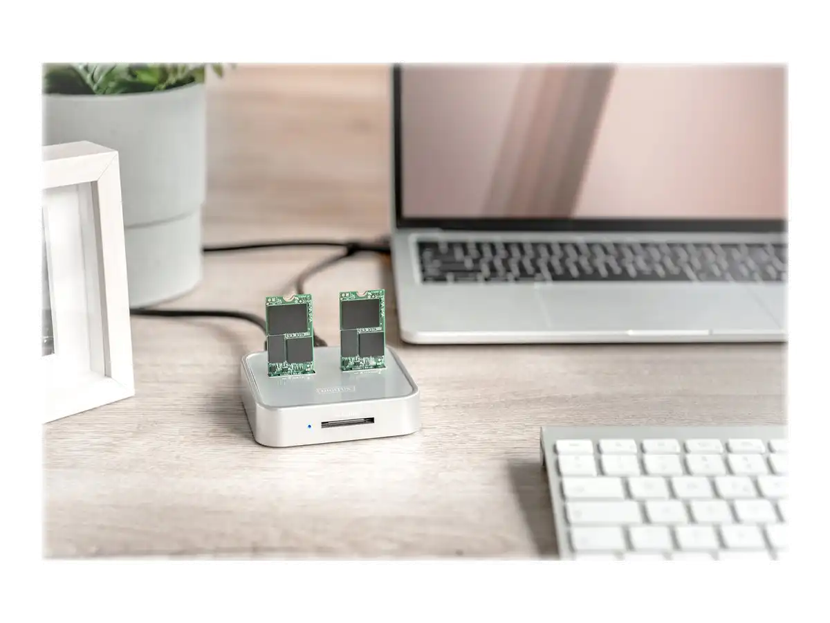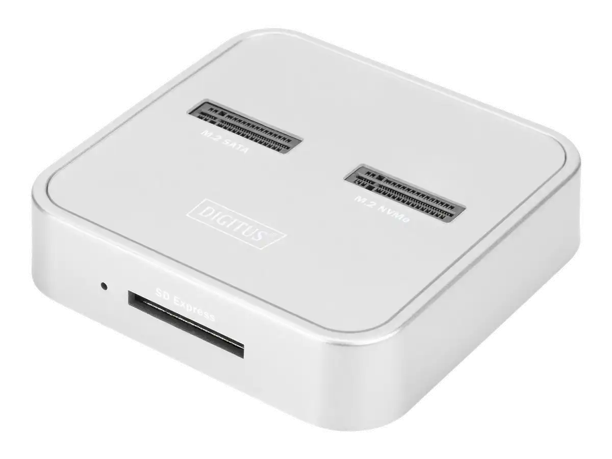 Die 3-in-1 Docking Station von DIGITUS® kann M.2 SSDs in NVMe- oder SATA-Technologie aufnehmen, zusätzlich befindet sich ein SD-Express 7.1 Kartenlesegerät mit höchsten Datentransferraten an Board. Verwalten Sie M.2 Datenträger mit bis zu 4 TB je Einschub und zusätzlich SD-Karten bis 2 TB. Unterstützt werden NVMe SSDs mit B+M Key & M-Key sowie SATA SSDs mit B+M-Key, jeweils in den Formaten 2242, 2260, 2280 & 22110. Erweitern Sie auf einfache Weise die Speicherkapazität zahlreicher USB-C Geräte wie PC, Notebook, TV-Geräte, Spielekonsolen oder Router.