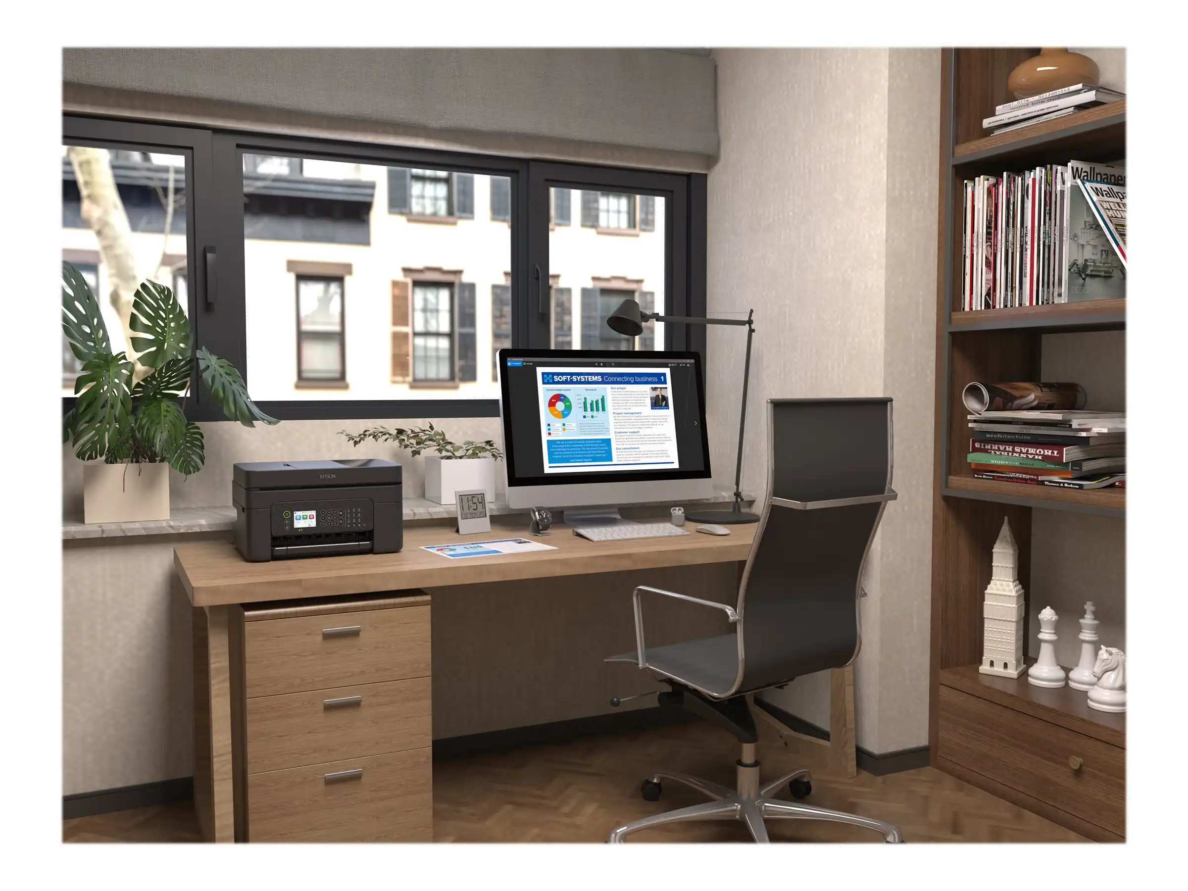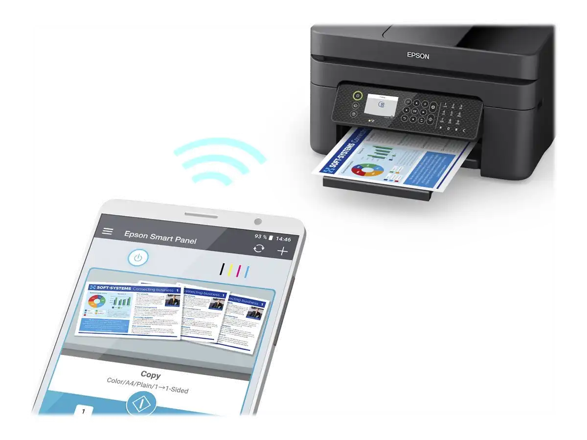 Weniger Ausgaben Drucken Sie von überall im Büro aus über WLAN oder mithilfe von Wi-Fi Direct auf kompatiblen WLAN-Geräten auch ganz ohne WLAN. Darüber hinaus können Sie mit der Smart Panel-App von Epson Ihren Drucker von Ihrem Smart-Gerät aus steuern, Dokumente drucken und Fehler beheben.