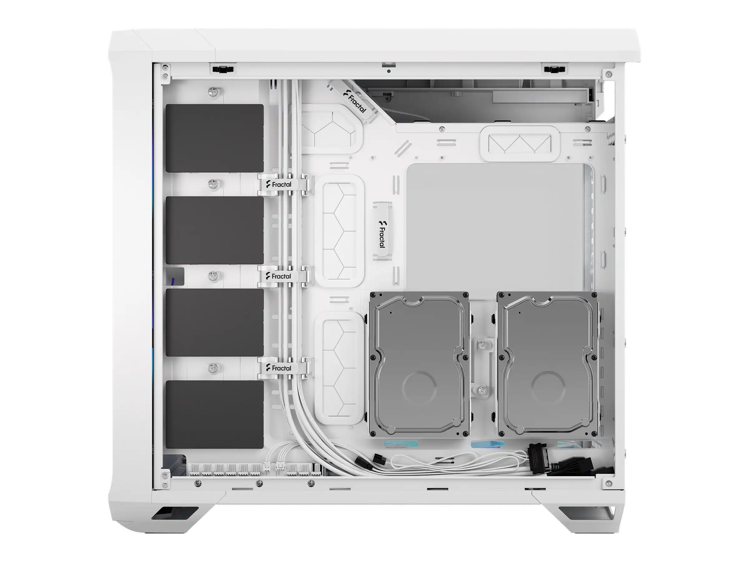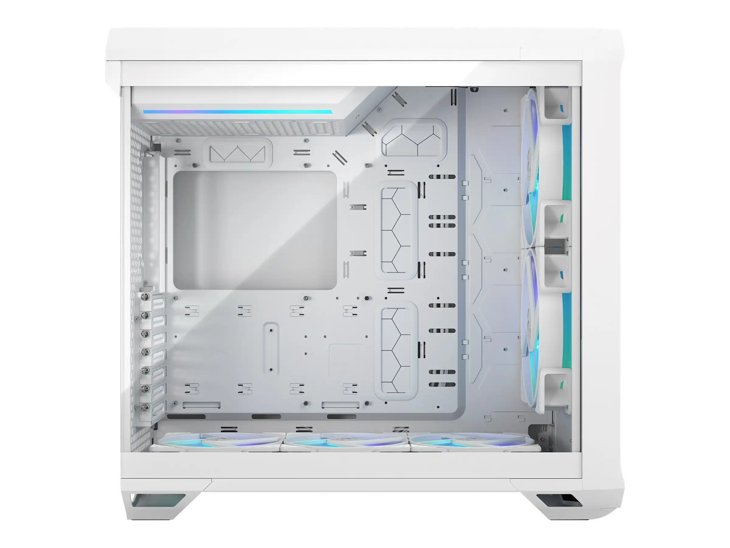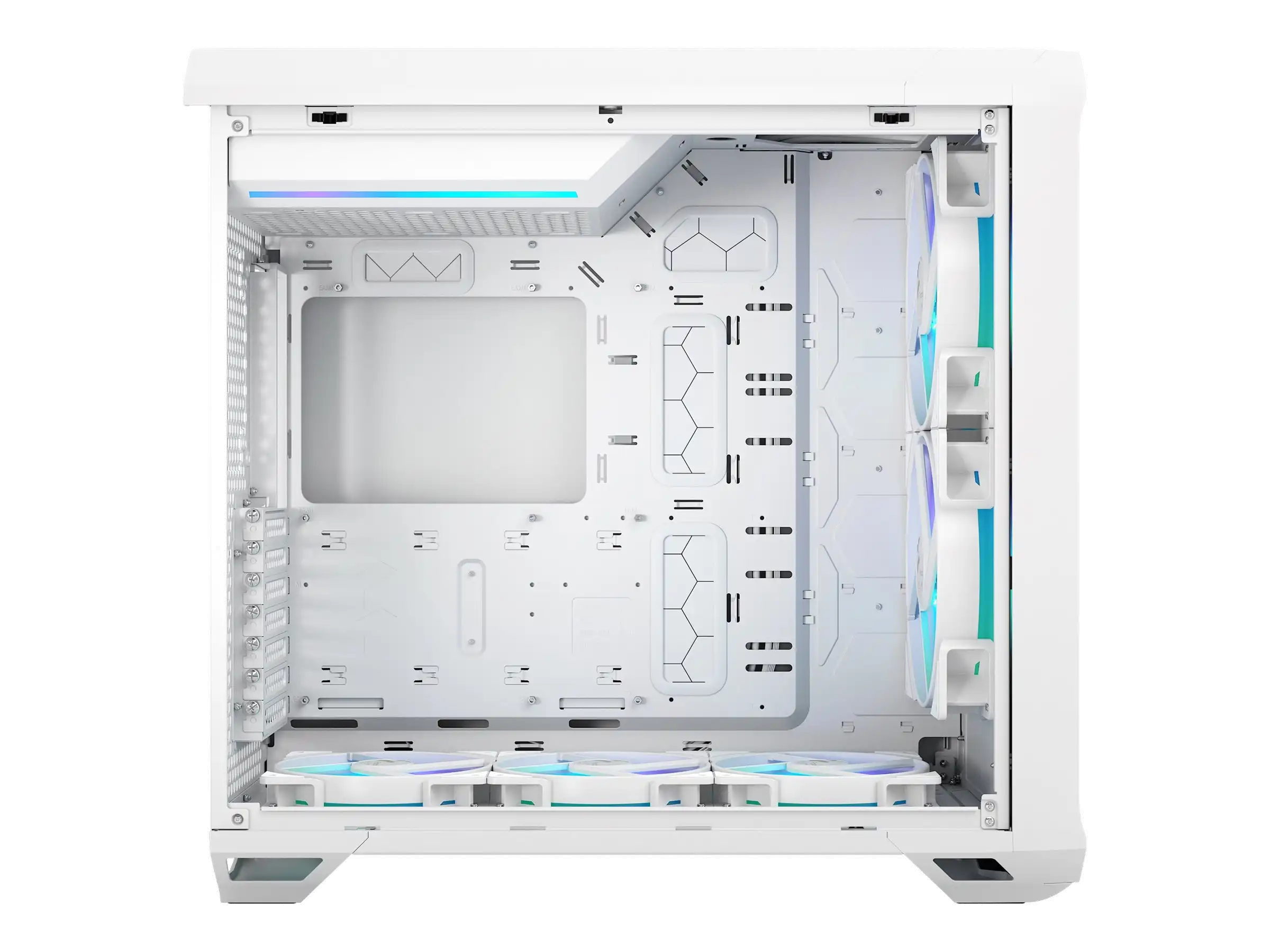 Klares Design - Rahmenlos integrierte Tempered Glass Panels, die schraubenlos an der Oberseite befestigt werden, ermöglichen schnellen, komfortablen Zugang zum Innenraum - Aerodynamische Netzteilabteilung an der Oberseite mit integrierten ARGB-Lichteffekten (nur TG Versionen) - Integrierte Unterstützung für einen Ausgleichsbehälter am Motherboard-Träger
