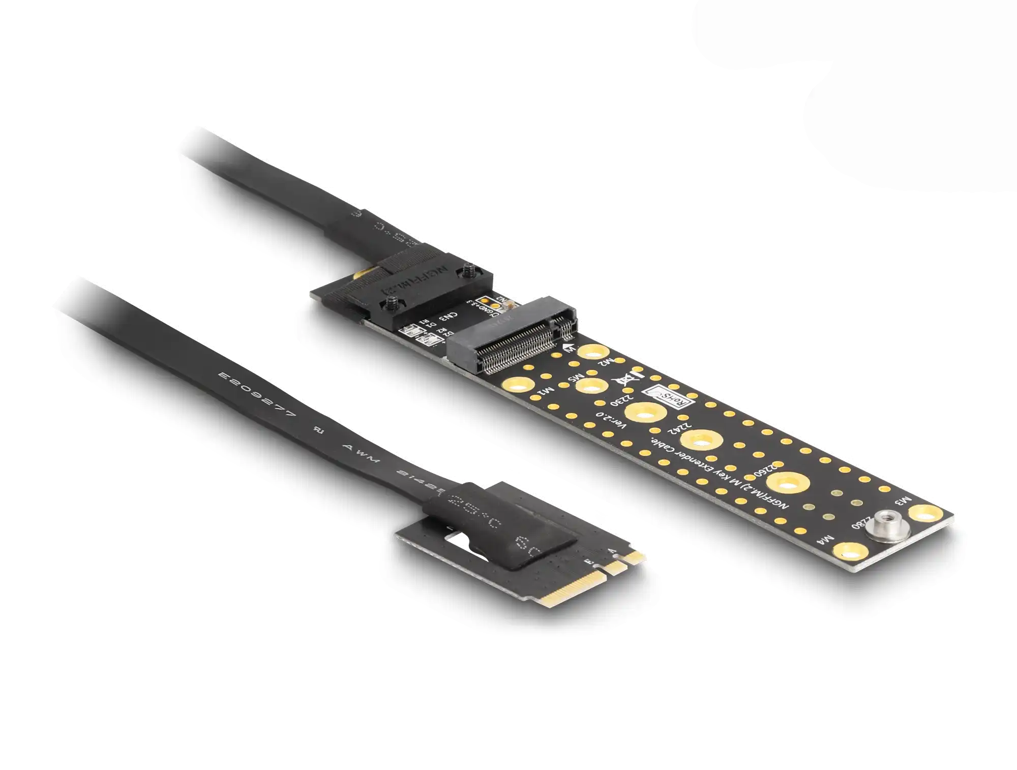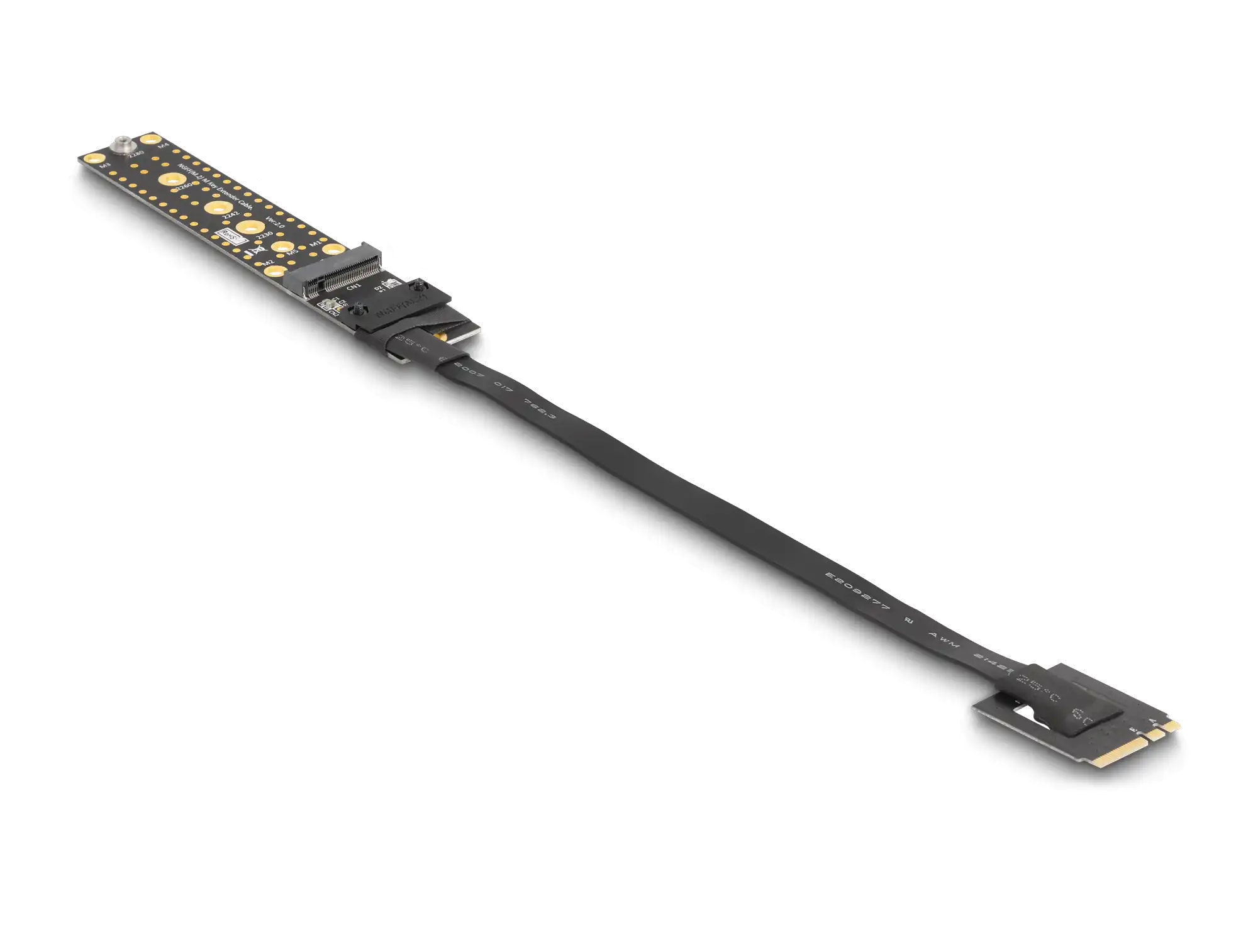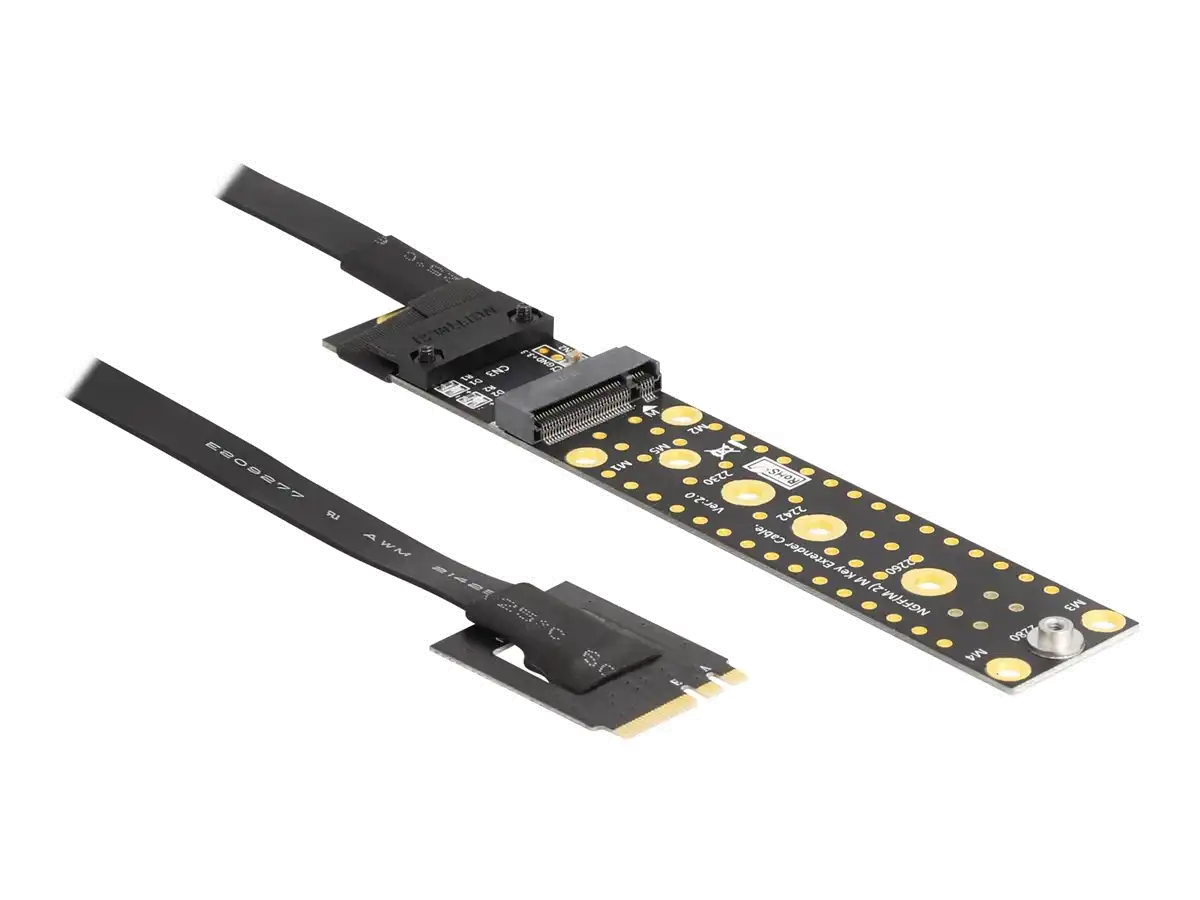 Mit dieser Riser-Karte von Delock kann eineM.2 SSD an einer optimalen Position im Gehäuse befestigt und angeschlossen werden. Das flexible Kabel ermöglicht einen platzsparenden Einbau im Computergehäuse.