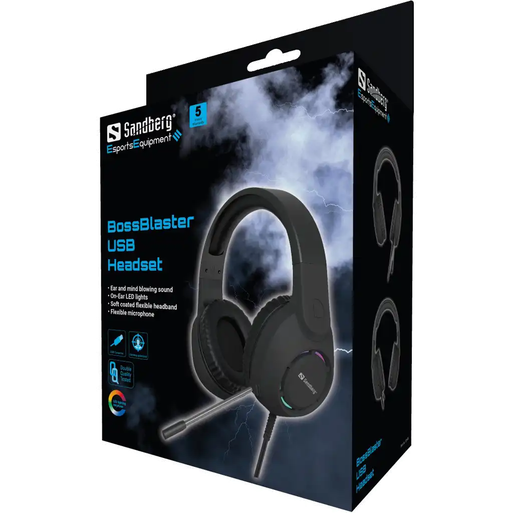 Das Sandberg-Headset BossBlaster USB ist ein wirklich schickes Gaming-Headset, das einen eindrucksvollen Stereosound für eine großartige Spielerfahrung bietet. Ein besonders sensibles Mikrofon gewährleistet, dass Ihre Gegner und Verbündeten Sie deutlich hören können. Der einstellbare Kopfbügel ist mit einer weichen und bequemen Polsterung ausgestattet, damit das Headset bequem viele Stunden am Stück zu tragen ist. Die Ohrpolster haben großartige, eingebaute LED-Lampen.