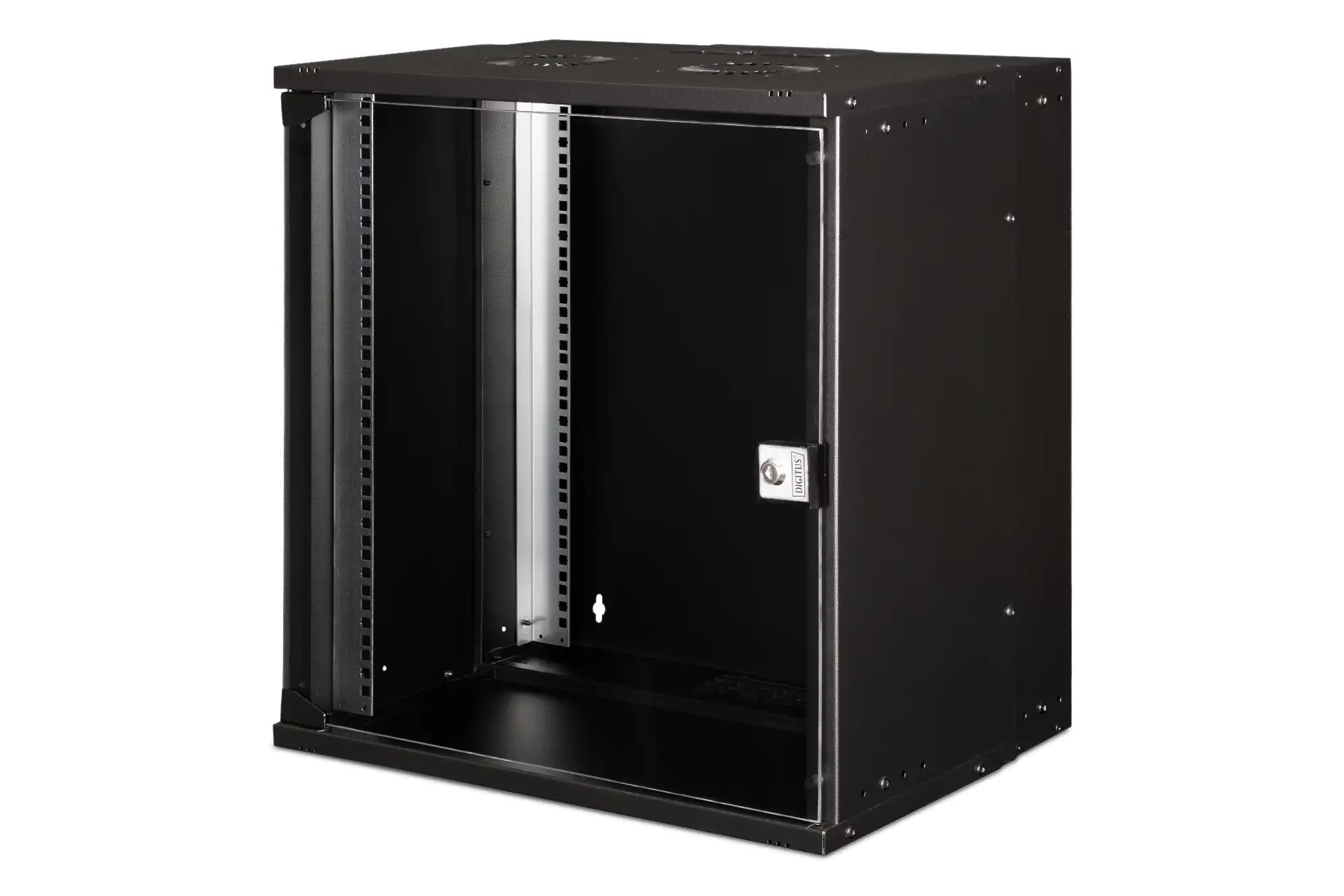· Schutzklasse IP20 · Abschließbare Sicherheitsglastür · 200° Türöffnungswinkel · 1-Punkt-Verriegelung an der Fronttür · 483 mm (19")-Profilschienen an der Vorderseite innerhalb des Schrankes montiert, galvanisiert · 483 mm (19")-Profilschienen sind in der Tiefe verstellbar · 1,1 - 1,5 starkes Stahlblech mit einer hohen Belastbarkeit, pulverbeschichtet · Kabeleingang mit Kunststoffabdeckung im Dach und Boden · Lüftungsschlitze für aktive sowie passive Be- und Entlüftung · Einbautiefe für Komponenten max.: 327 mm · Produktabmessungen (H x B x T): 595 x 540 x 400 mm