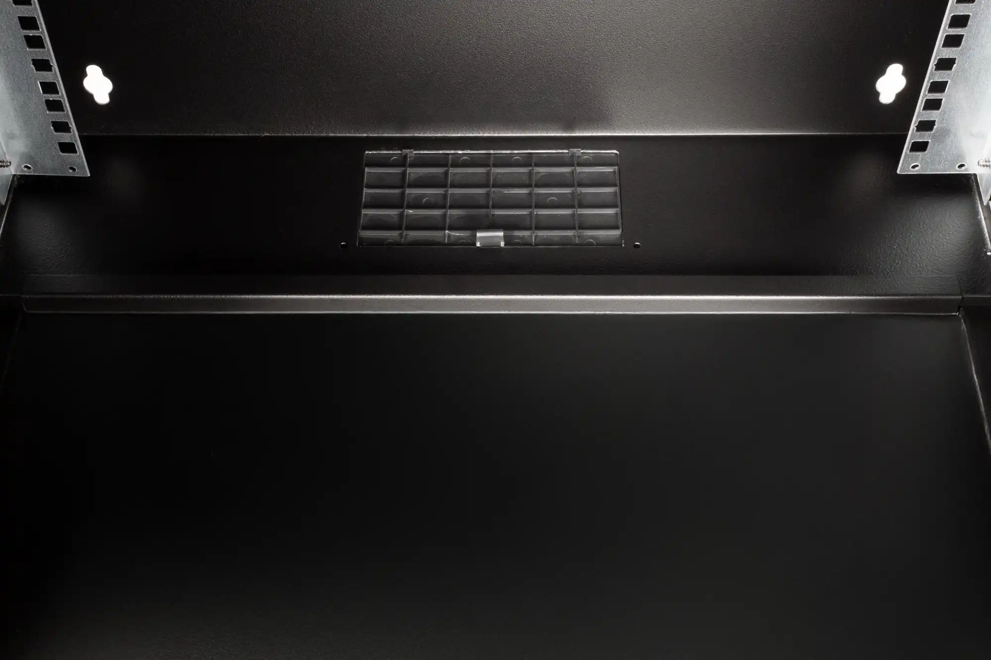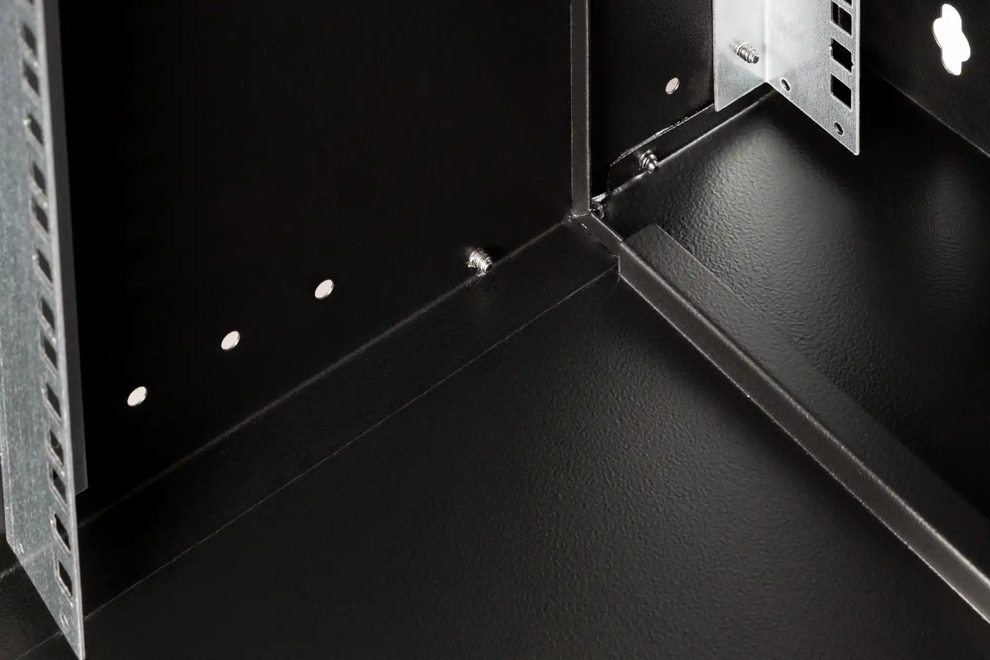 483 mm (19")-Profilschienen an der Vorderseite innerhalb des Schrankes montiert, galvanisiert