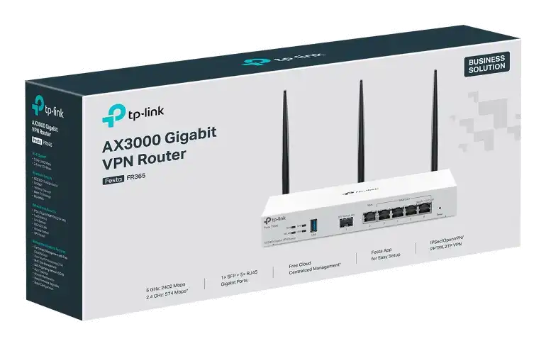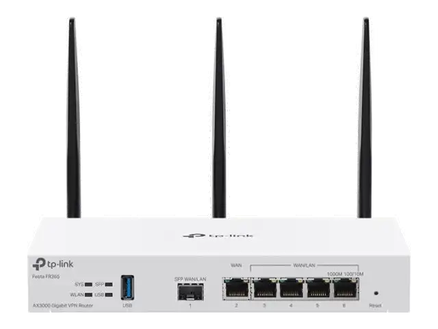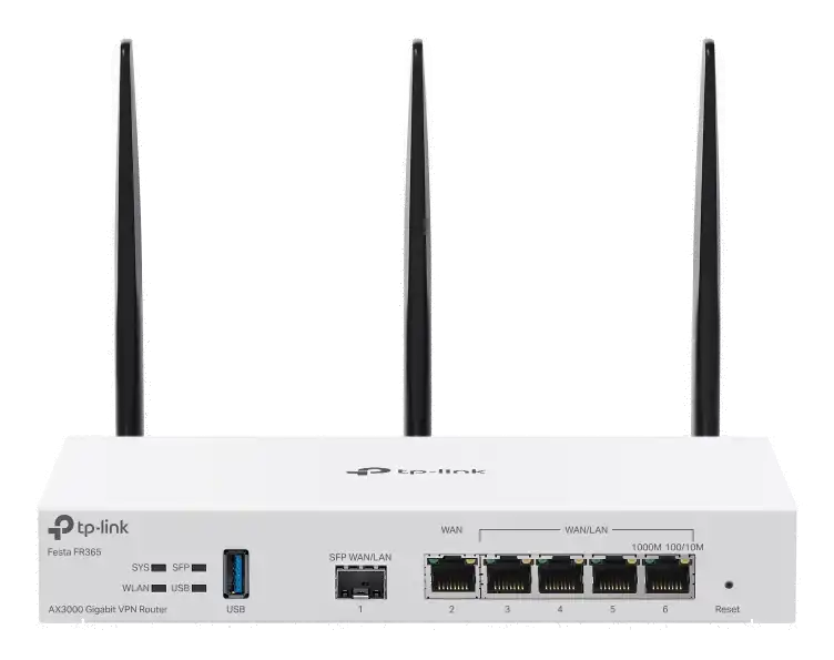 Festa FR365 AX3000 Wi-Fi 6 Gigabit VPN RouterPORT: 1× Gigabit SFP WAN/LAN Port, 1× Gigabit RJ45 WAN Port, 4× Gigabit WAN/LAN RJ45 Ports, 1× USB 3.0SPEED: