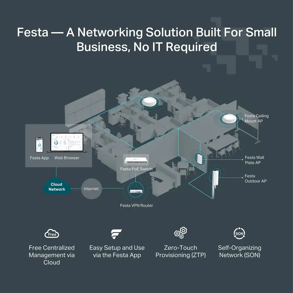 Effiziente Netzwerkverwaltung Ausgestattet mit Funktionen wie MU-MIMO-Technologie, nahtlosem Roaming und Zero-Touch-Provisioning (ZTP) vereinfacht das TP-Link Festa FR365 V1.2 das Netzwerkmanagement, verbessert die Wireless Abdeckung und gewährleistet eine ununterbrochene Konnektivität im gesamten Netz.