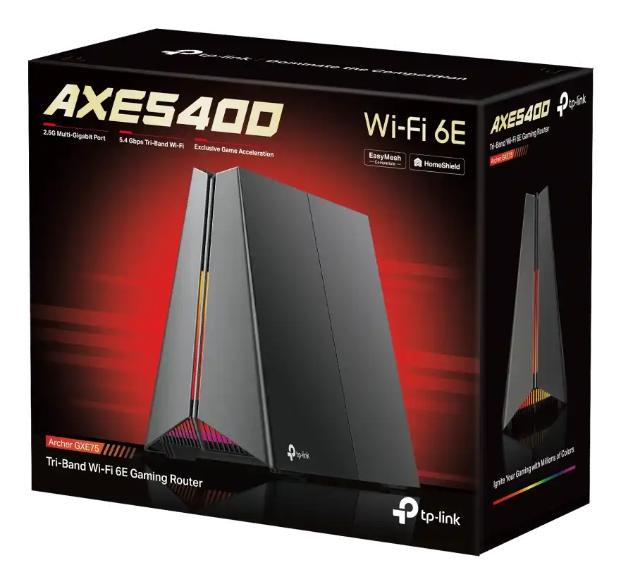 Archer GXE75 AXE5400 Tri-Band Wi-Fi 6E Gaming RouterSPEED: 574 Mbps at 2.4 GHz + 2402 Mbps at 5 GHz + 2402 Mbps at 6 GHzSPEC: 4× Internal Antennas, 1.7GHz