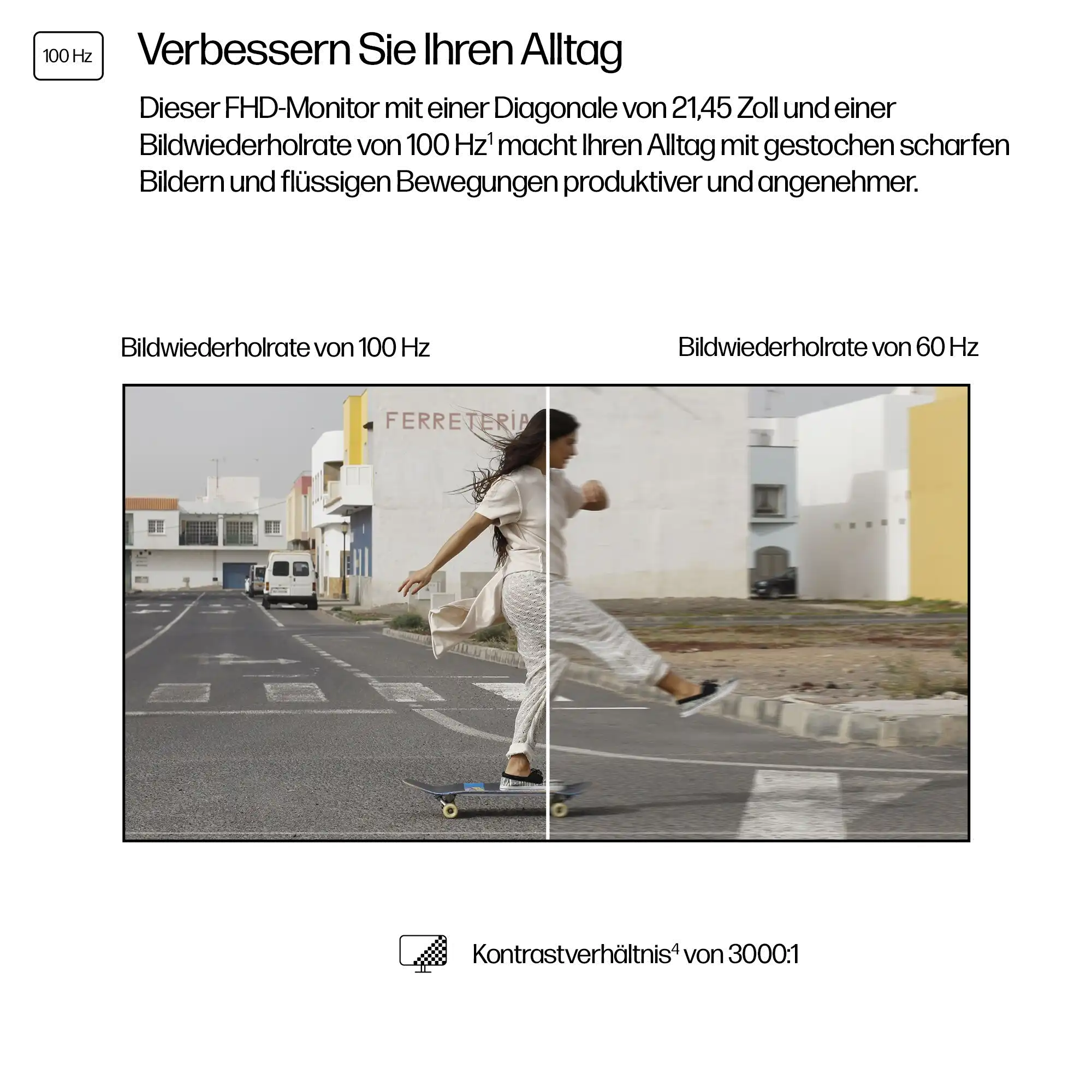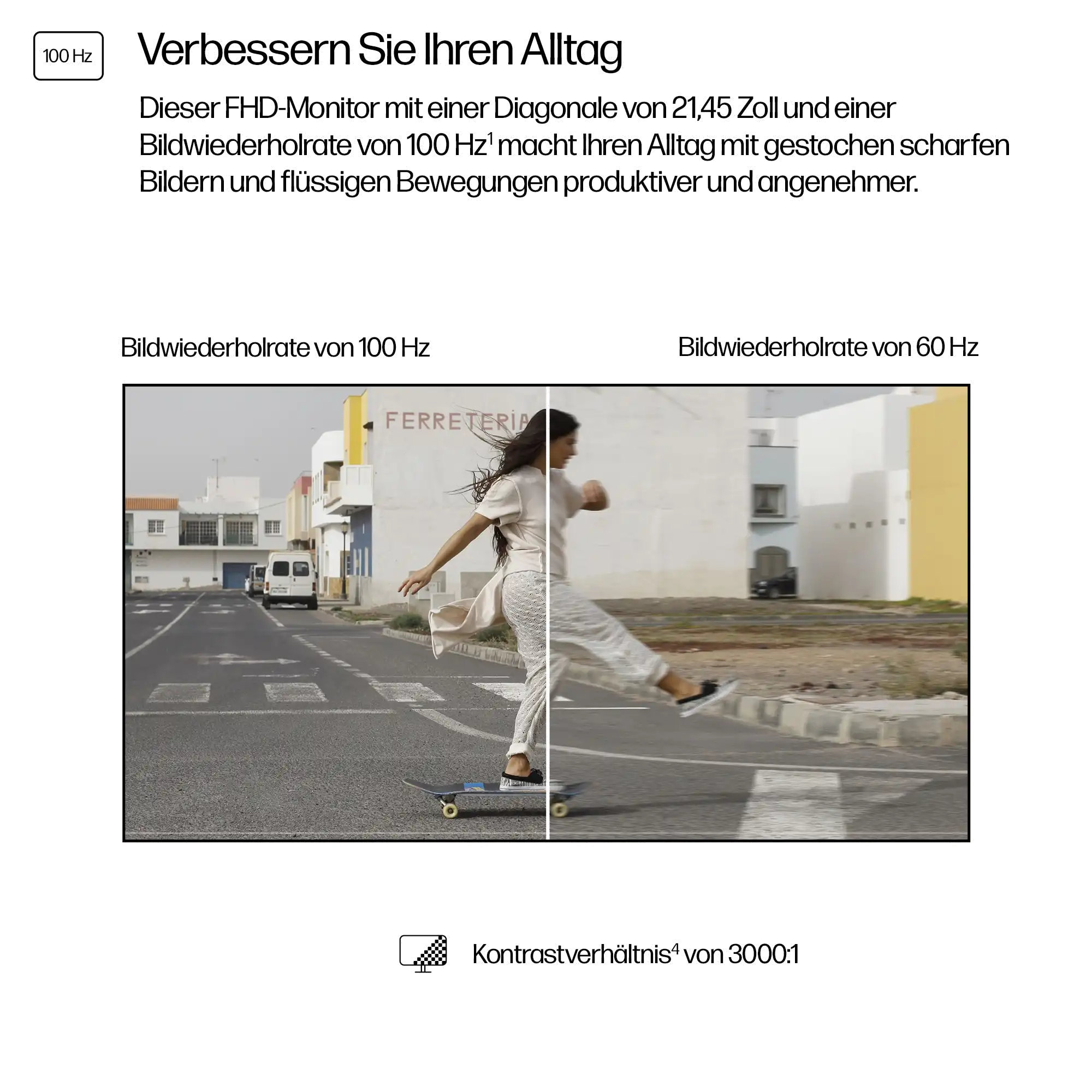 Bildwiederholrate von 100 Hz Erleben Sie ruckelfreie, lebensechte Videos und klare Details mit einer Bildwiederholrate von 100 Hz, die von Bild zu Bild für flüssige Bewegungen sorgt.