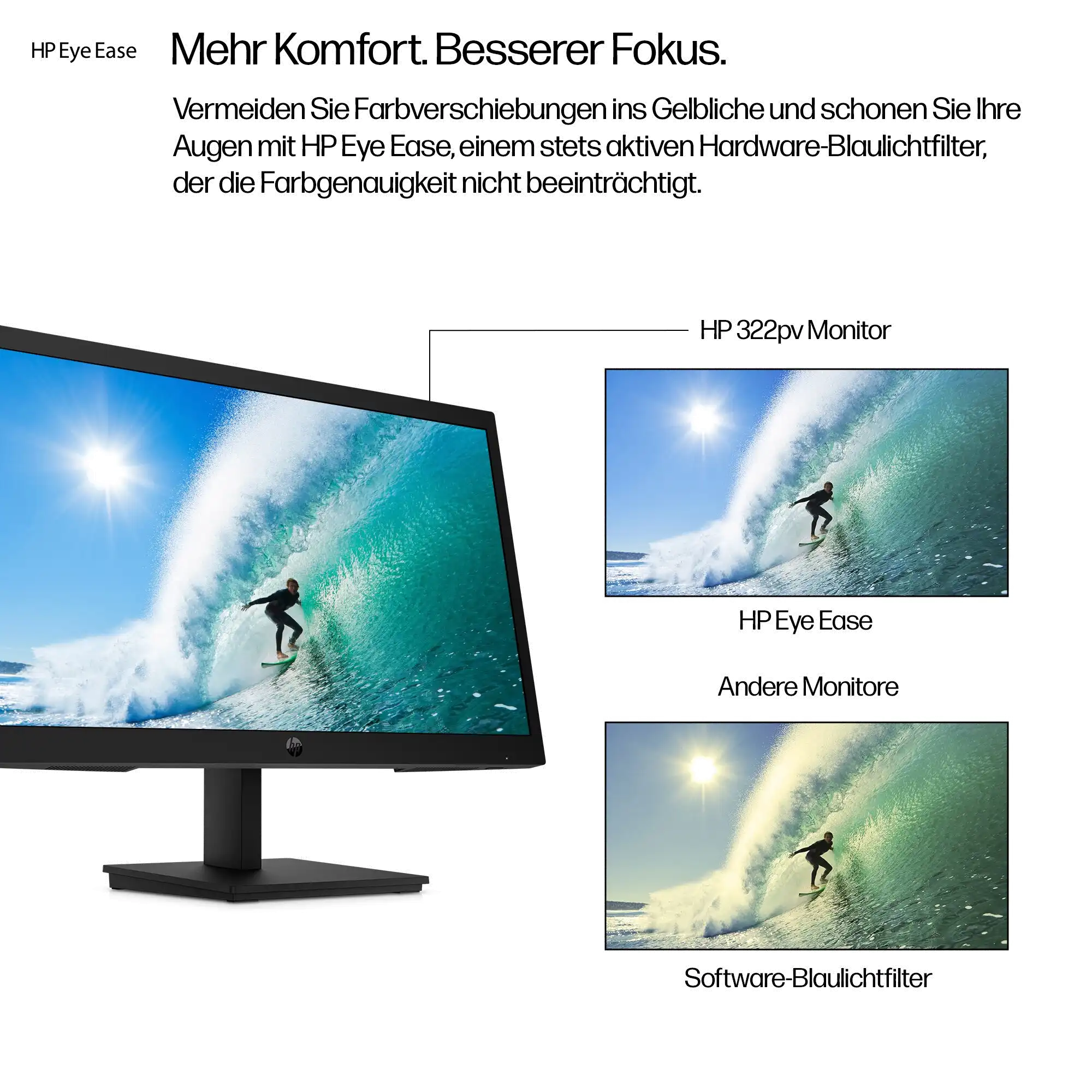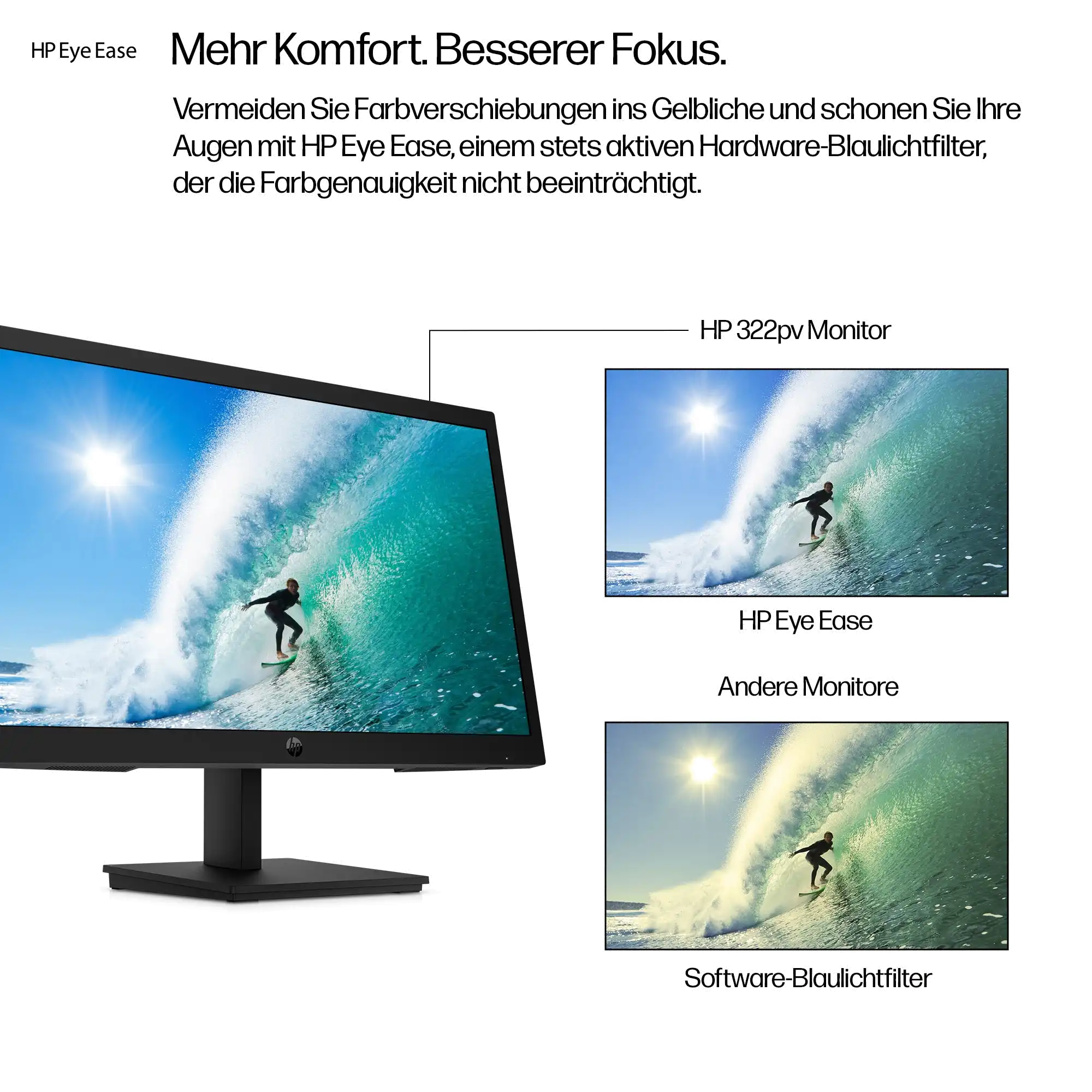 Durchgehend aktiver True Color Blaulichtfilter HP Eye Ease, ein stets aktiver Hardware-Blaulichtfilter, schont Ihre Augen durch Reduzieren des Blaulichtanteils – ohne eine Farbverschiebung ins Gelbliche.