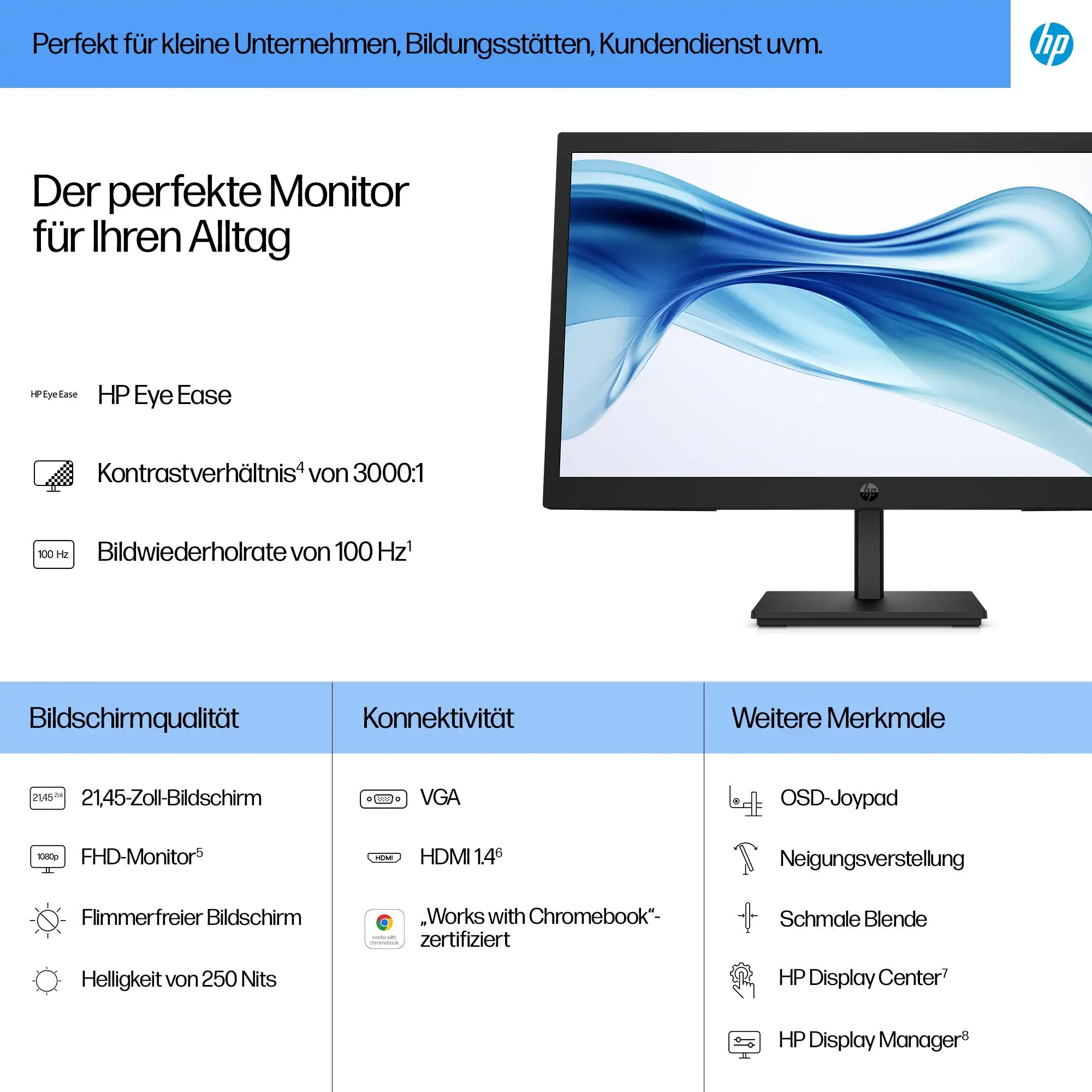 Dieser 21,45-Zoll-FHD-Monitor mit bis zu 100 Hz Bildwiederholrate[1] liefert scharfe Bilder und gibt Bewegungen flüssig wieder, um Ihre tägliche Nutzungserfahrung produktiver und befriedigender zu gestalten.