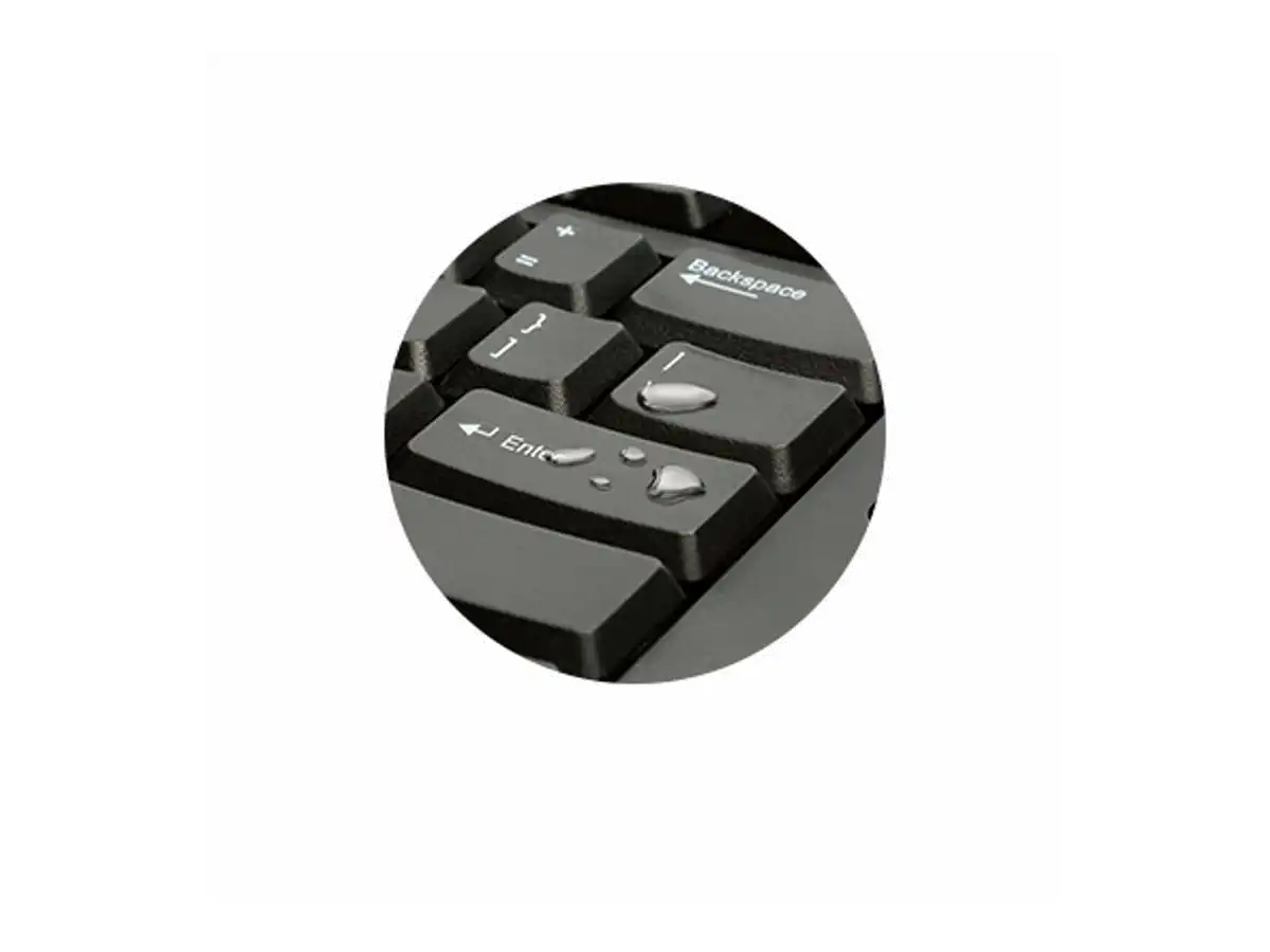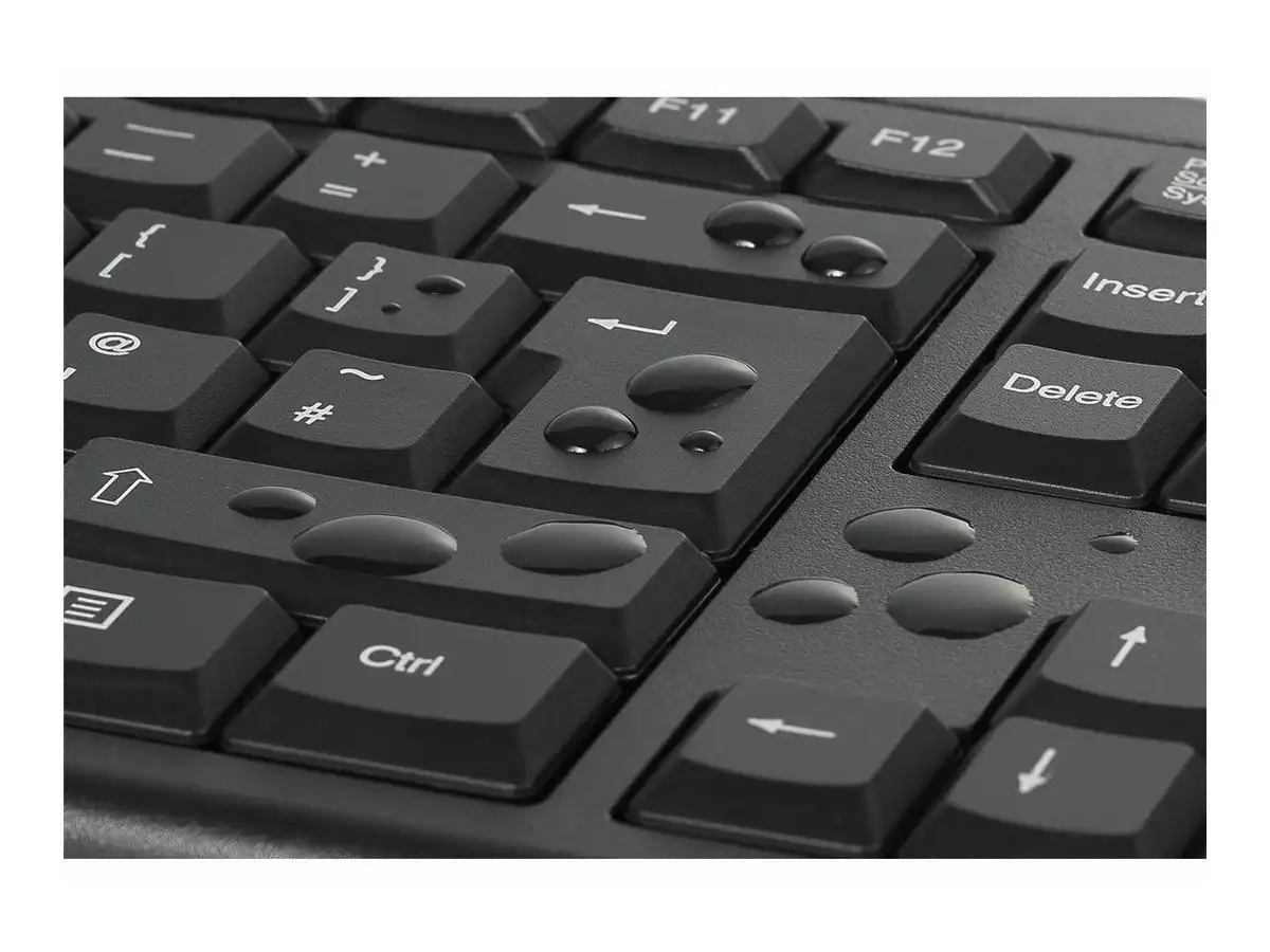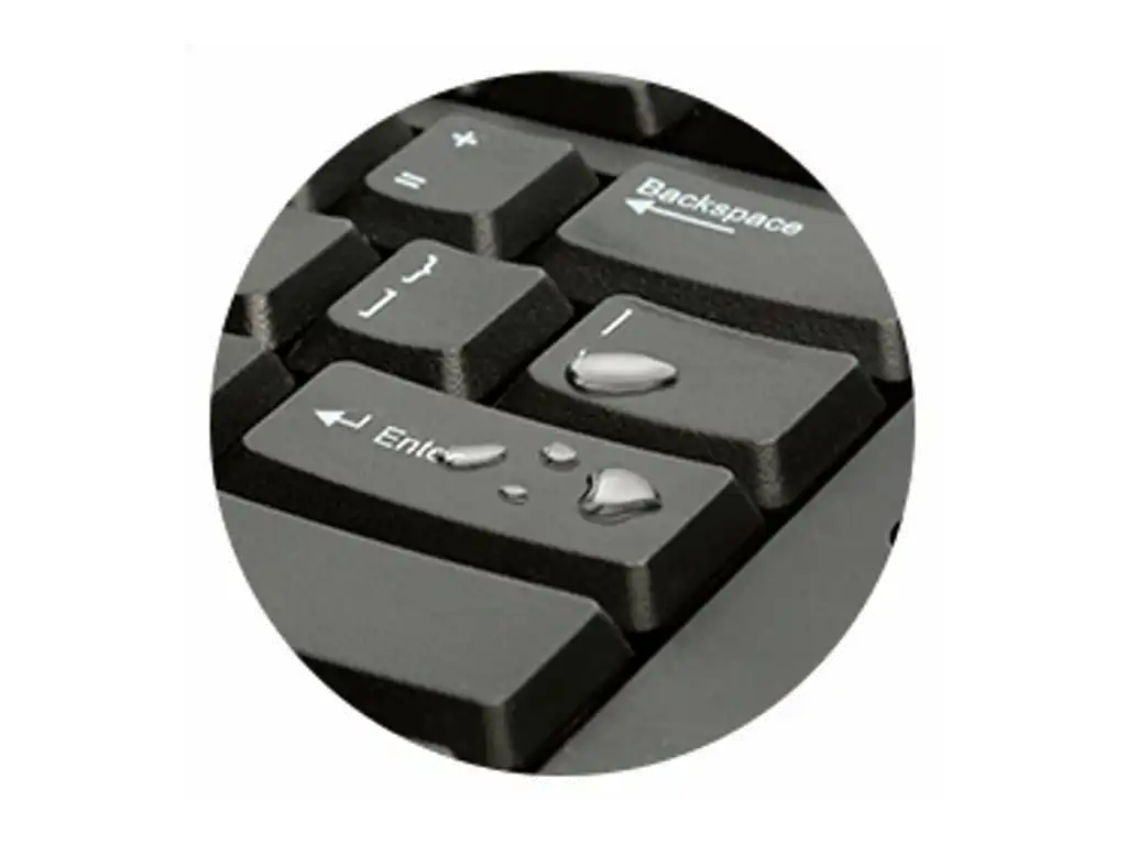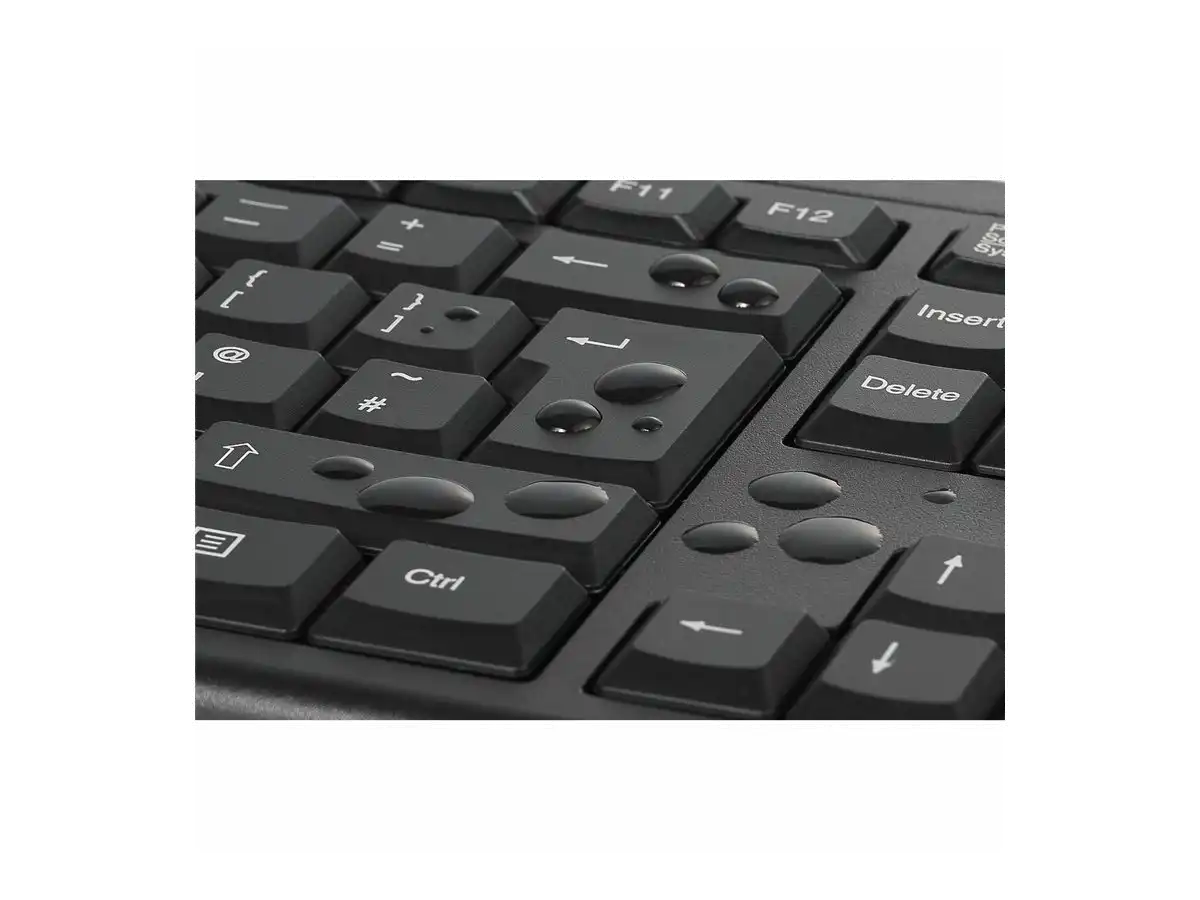 Die Versiegelung durch eine Membran stellt sicher, dass verschüttete Flüssigkeiten die Elektronik nicht beschädigen. Die Tastatur kann einfach trocken gewischt werden.