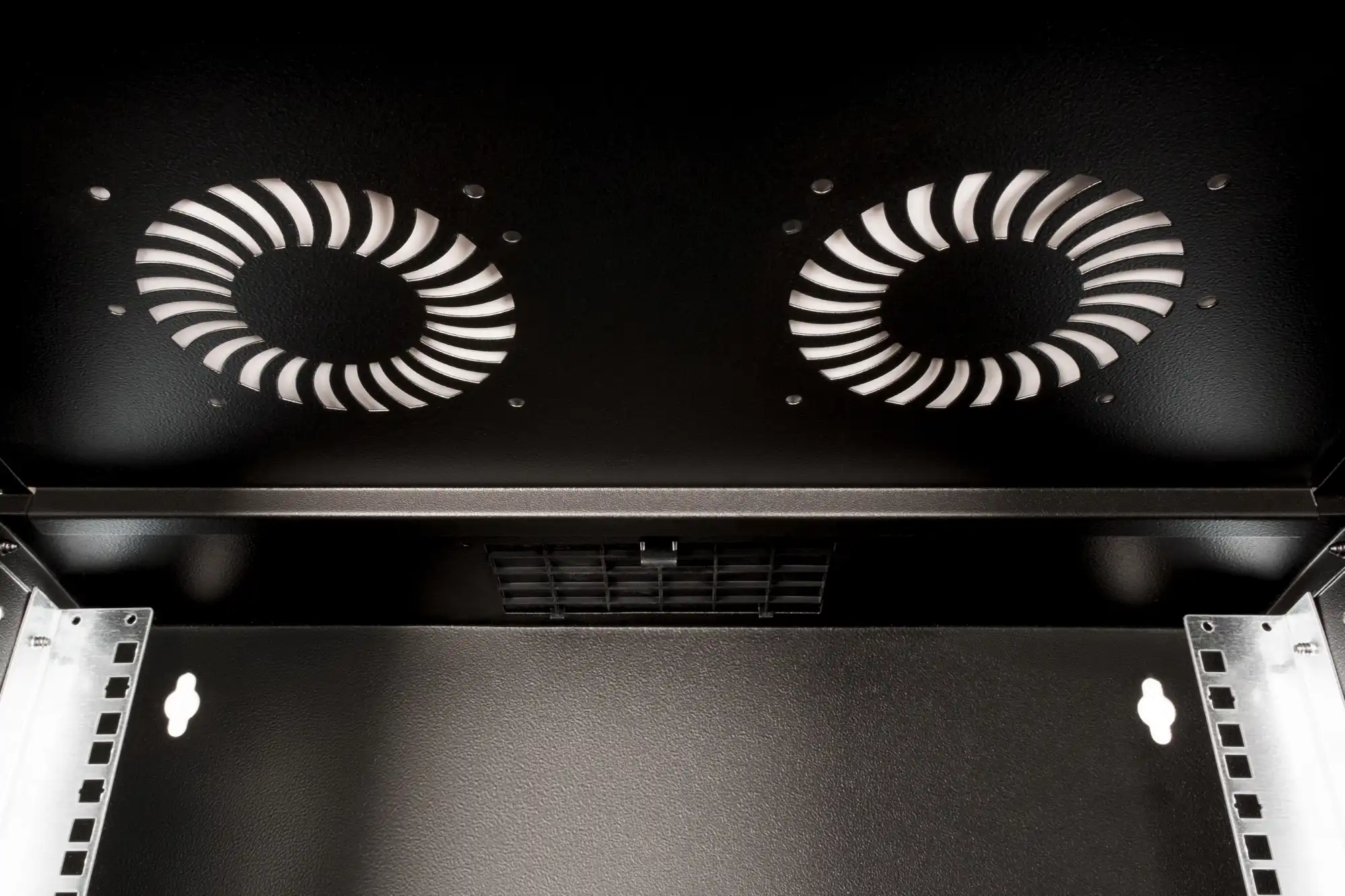 483 mm (19")-Profilschienen an der Vorderseite innerhalb des Schrankes montiert, galvanisiert