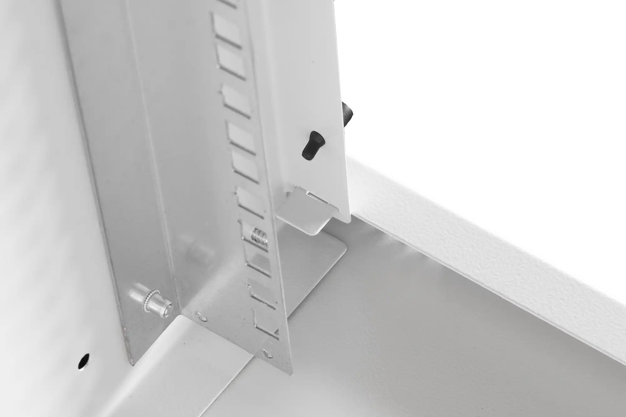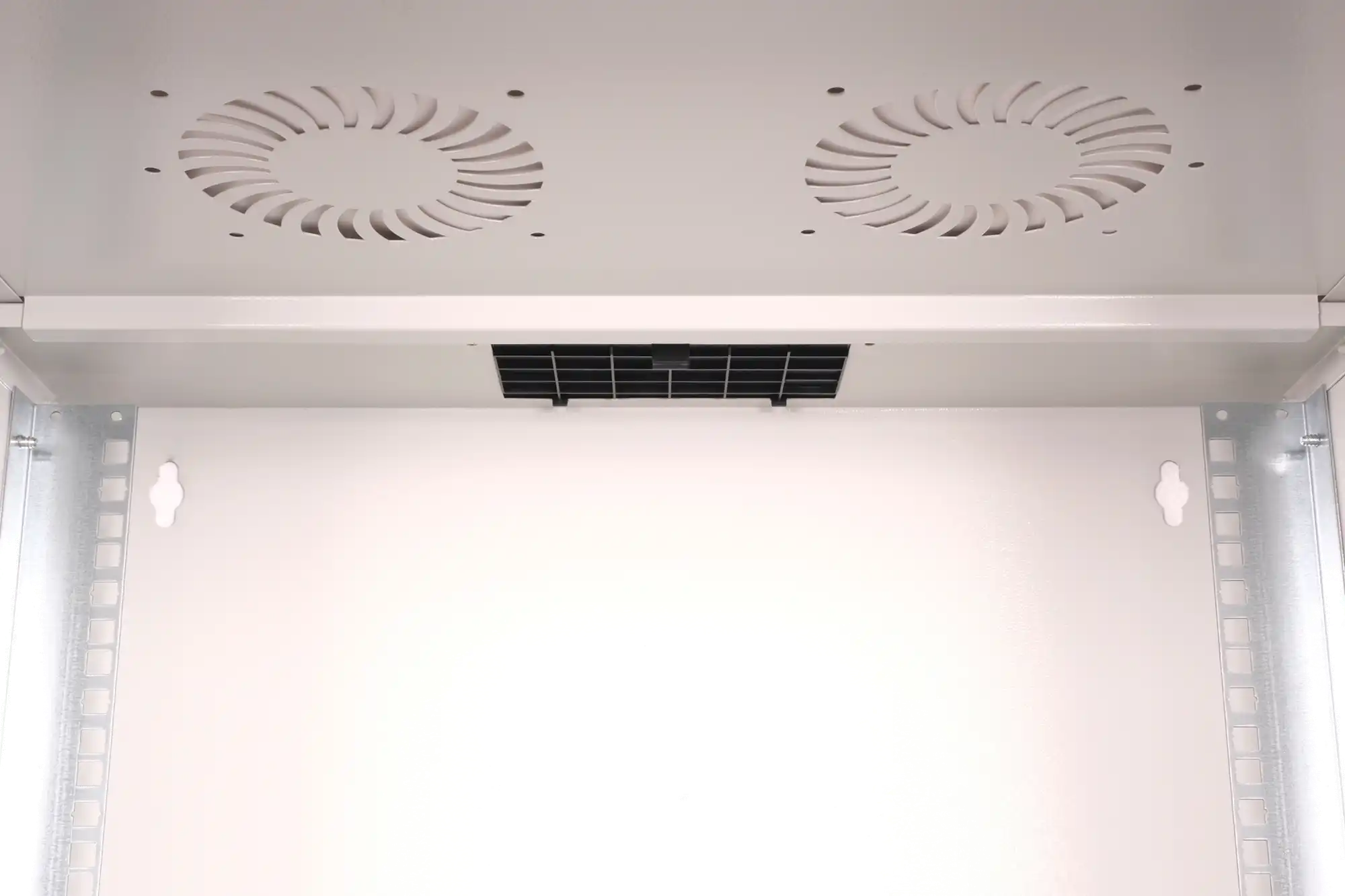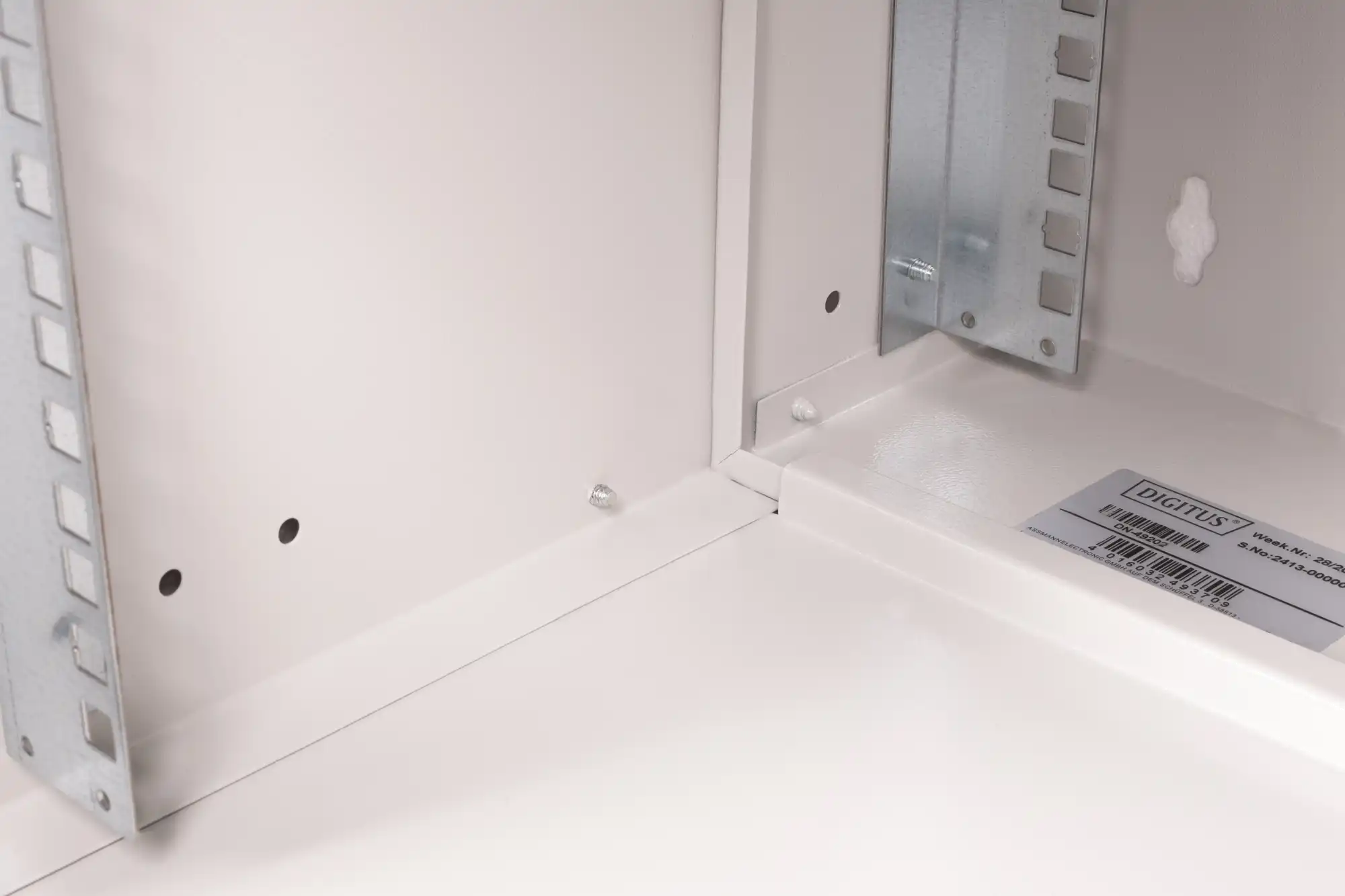 483 mm (19")-Profilschienen an der Vorderseite innerhalb des Schrankes montiert, galvanisiert
