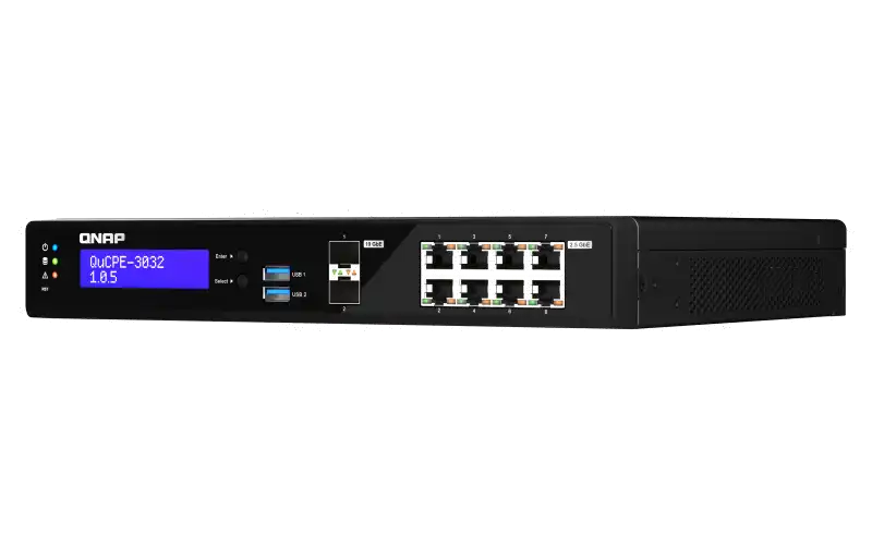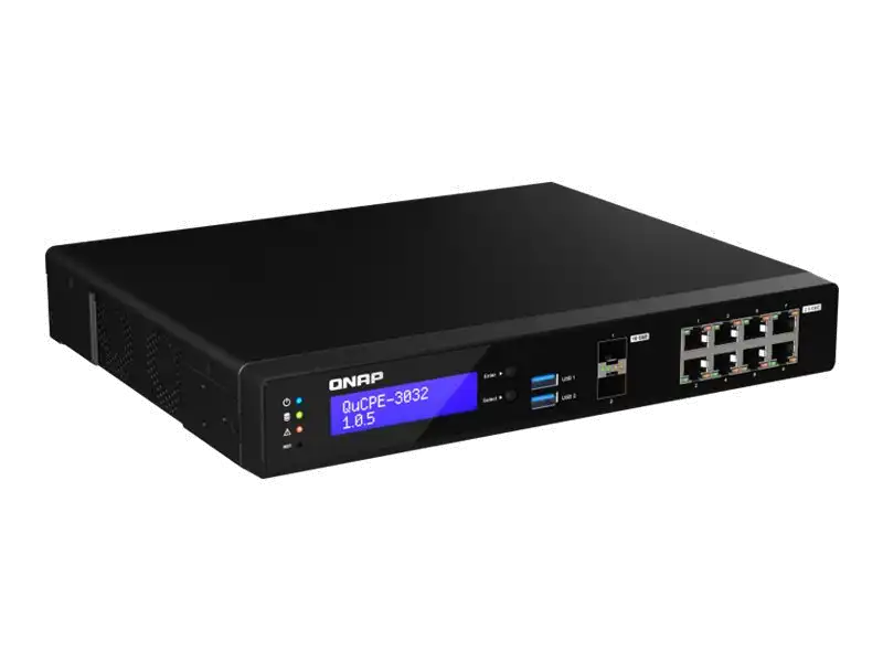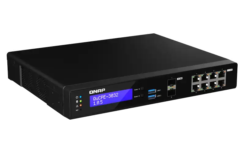 Das Netzwerkvirtualisierungsgerät QuCPE-3032 von QNAP ist eine universelle Virtualisierungsplattform, die speziell für kleine und mittlere Unternehmen entwickelt wurde. Das QuCPE-3032 nutzt den leistungsstarken Intel Atom Refresh Quad-Core-Prozessor, der Intel QAT, Smart NIC SR-IOV und DPDK-Hardwarebeschleunigungstechnologien unterstützt, und bietet außerdem acht 2,5 GbE RJ45-Ports und zwei 10 GbE SFP+-Ports. Mit verbesserter Bandbreite und Rechenleistung für die Ausführung von VNFs und SD-WAN-Verbindungen eignet sich der QuCPE-3032 für Multi-User- und Multi-Tasking-Geschäftsanwendungen. Der QuCPE-3032 verfügt außerdem über das QNE OS für die Verkettung von VNF-Diensten und die zentralisierte Bereitstellungs- und Verwaltungsplattform AMIZ Cloud, um eine flexible Zero-Touch-Bereitstellung zu ermöglichen.