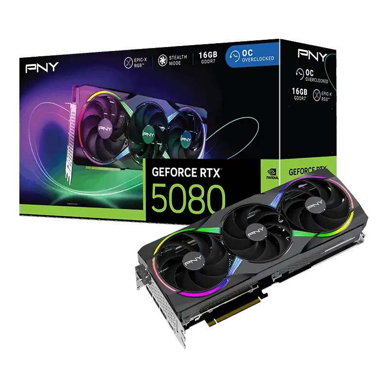 StartseiteKomponentenGrafikkartenPNY GeForce RTX 5080 16GB ARGB OC Triple Fan - GrafikkaSKUVCG508016TFXXPB1-OCLS#4598913PNY GeForce RTX 5080 16GB ARGB OC Triple Fan - Grafikka